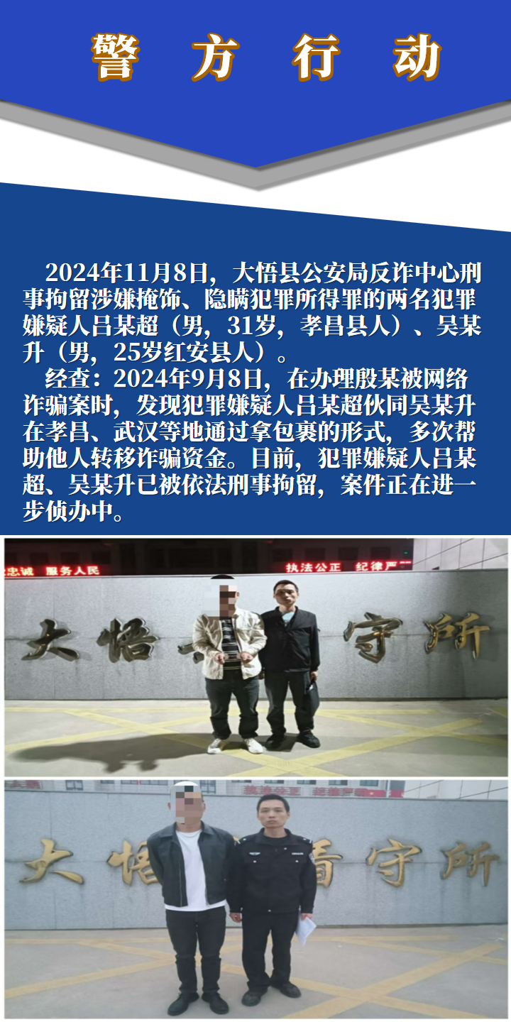 多次帮助他人转移诈骗资金,大悟公安局刑事拘留2名犯罪嫌疑人【反诈每周新闻发布】