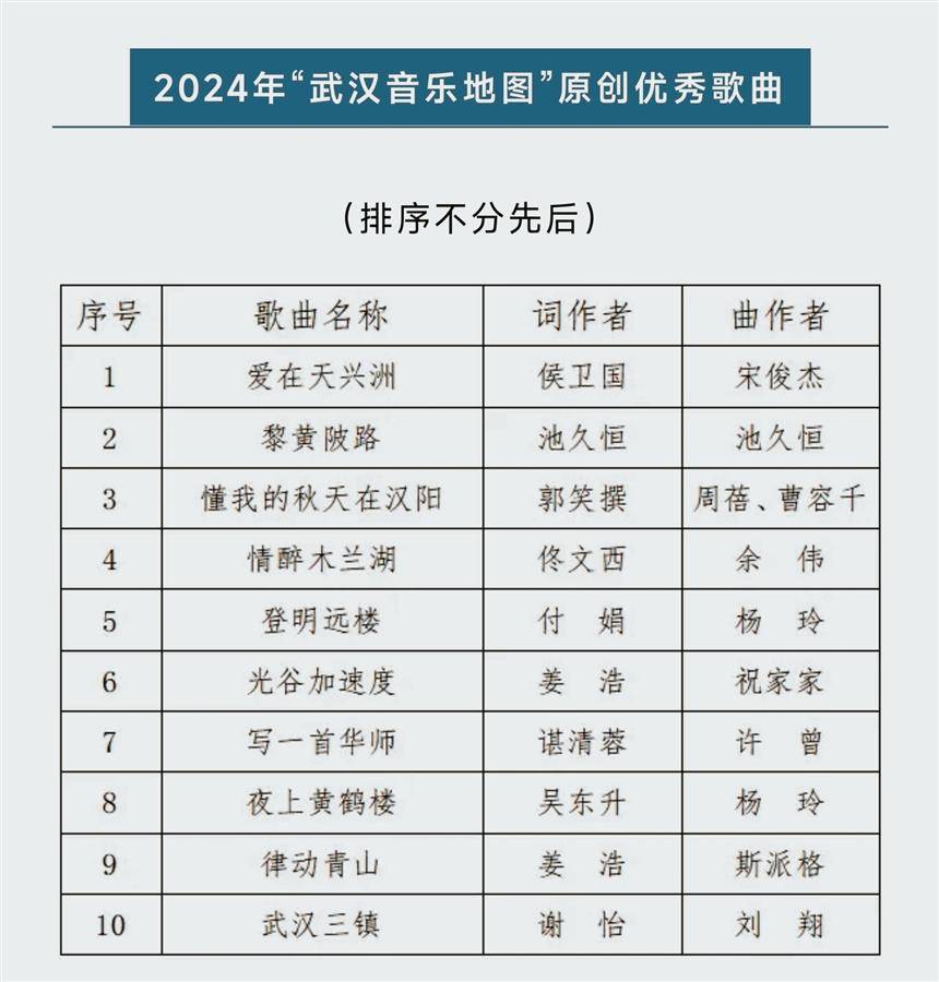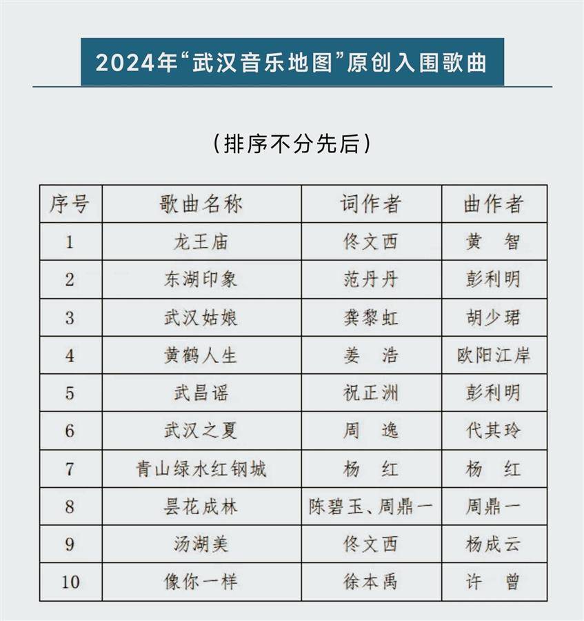 “武汉音乐地图”是由武汉市文联、长江日报社等联合推出的一项音乐文化品牌活动,旨在以音乐的形式传承城市文脉、焕新文化活力,用歌曲展现武汉之美。去年,首届“武汉音乐地图”原创歌曲征集中,《东湖美》《江之岸》等10首作品获评十佳优秀歌曲。2024年的征集评选活动自4月至9月面向社会开展,共收到歌曲101首,经专家评审团评审并公示,最终20首作品榜上有名。