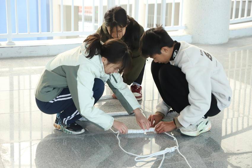 在软绳梯制作项目中,选手们三人一组,默契配合,灵巧穿梭、打结,最终制作出既结实又美观的软绳梯,彰显了团队合作的力量。