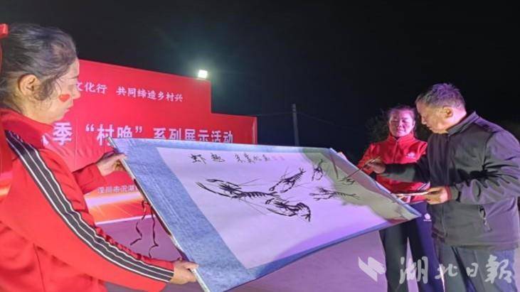 伴随着一曲振奋人心的战鼓舞《中国红》,“村晚”拉开了帷幕,《我和我的祖国》《最亲的人》《和谐中国》,让喜爱歌曲联唱的老年人直呼“过瘾”;音乐快板《汉川阔步新征程》、武术表演《豆浆打花棍》、民俗传统艺术《皮影戏》等喜闻乐见的节目,则越发让村民感觉“接地气”;多才多艺的村民现场作起画来,栩栩如生的《虾趣图》充分展示了这片鱼米之乡的魅力。