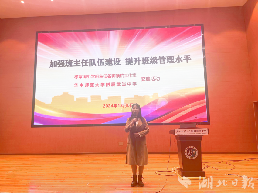 湖北日报客户端讯 (通讯员 陈秀 杨雅静)为进一步推动徐家沟小学教联体的建设与发展,充分发挥班主任名师领航工作室的示范和引领作用,促进城乡班主任之间的交流与合作,丹江口市徐家沟小学于2024年12月6日在华中师范大学附属武当中学成功举办了班主任领航工作室的送教下乡活动。此次活动以“加强班主任队伍建设,提升班级管理水平”为核心主题,旨在探索在教联体背景下班主任培训与专业发展的新路径,以推动班主任工作的优质均衡发展。
