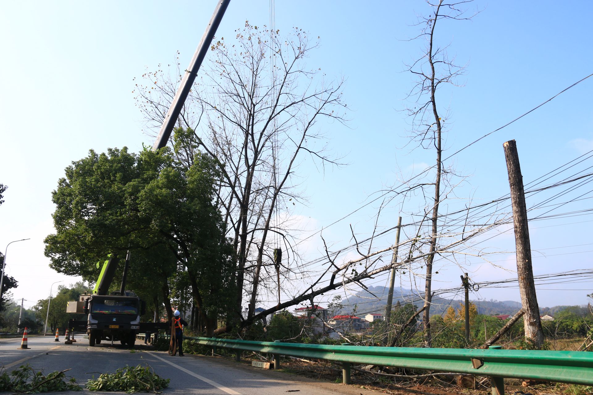 经验丰富的刘春风向园林现场指挥人员讲解树枝与电线安全距离及修剪、砍青时的安全注意事项,陈贵供电所所长叶亚权负责根据现场情况标记出可能影响线路安全的树木范围,指导园林工人避开危险区域,合理修剪、移除树木。经过8个多小时的奋战,大家圆满完成了当日清障任务。