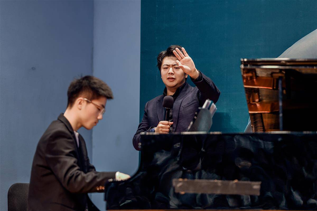 在陆宇飞弹奏的过程中,郎朗站在他的身后,认真专注地欣赏倾听。一曲结束,郎朗耐心地拆解分析每一个段落,甚至亲自示范。讲解时一手拿话筒,另一只手演示节拍强弱,讲到重音处理的细节时,会猛然重踩一下地板,身体前倾,犹如演奏时陶醉沉浸的状态。