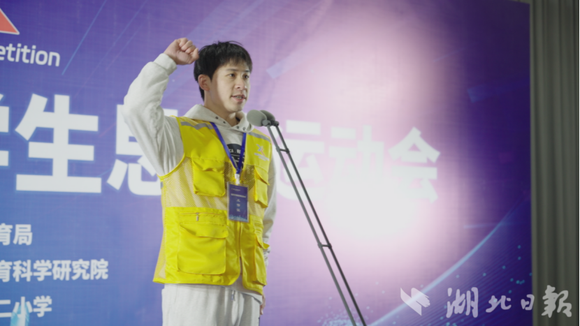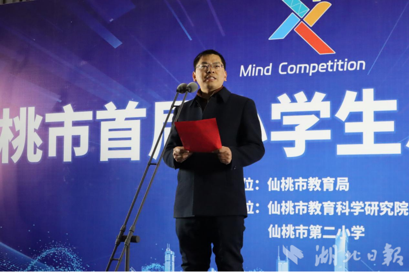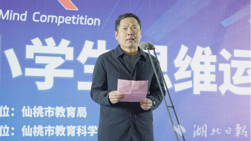 随着激昂的国歌声响起,仙桃市首届思维运动会正式拉开帷幕。仙桃市教育局党组书记、局长杨俊武发表致辞。他表示,举办仙桃市首届小学生思维运动会,是我市积极响应国家强化科技教育和人文教育协同、全面提高学生综合素养的重要举措。创新思维是孩子未来竞争力的关键所在,我们期望搭建这种充满智慧与挑战的平台,点燃更多孩子对科学的热情,培养他们的创新思维与解决问题的能力,成长为具有创新精神和实践能力的时代新人。希望这次思维运动会能够成为推动我市教育创新、促进学生全面发展的新起点。最后,裁判员代表和运动员代表分别上台宣誓。