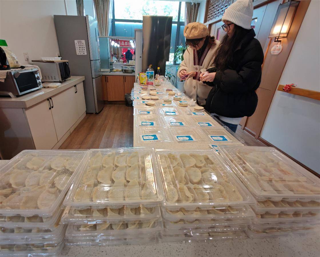 社区志愿者和老人们一起包饺子,如同一个温暖的大家庭。大家分工明确,有条不紊。有人负责准备馅料,有人负责擀出平滑的面皮,氛围温馨而又和谐。柳叶饺、三角饺、月牙饺、元宝饺、福袋饺、糖果饺……大家包出形状各异的饺子,元宝饺子象征健康团圆,月牙饺子寓意笑口长开,糖果形状则代表幸福甜蜜……大家齐心协力,不一会桌子上摆满了热气腾腾的饺子。