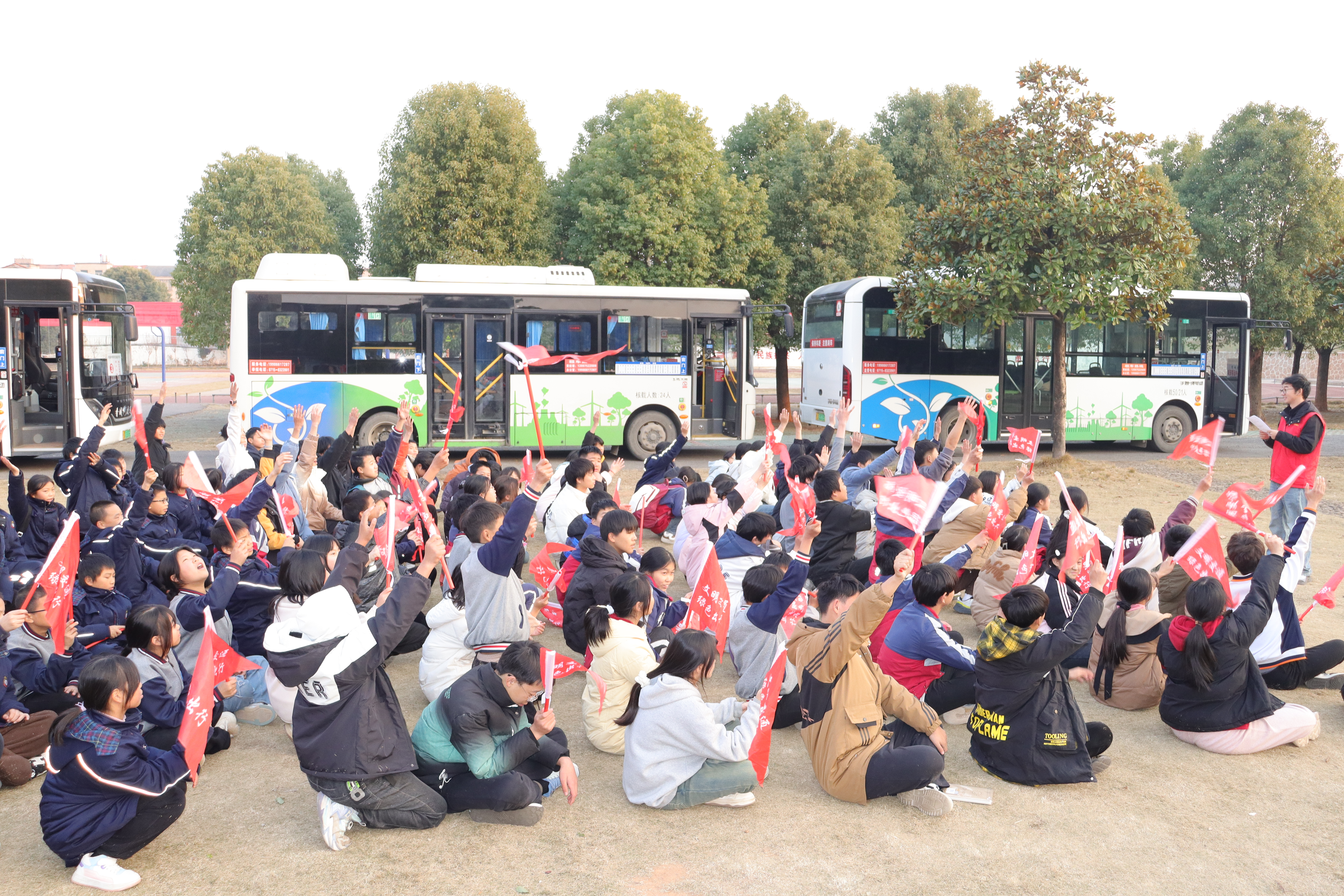 今天是周五,学校还没有放假,几辆公交车就整齐地停在教学楼前,据悉,这几辆公交车用于搭载双溪中学的学生放假回家,随着一阵下课铃响起,同学们陆续地来到了教学楼下,工作人员为学生们发放了“文明交通,绿色出行”的小旗,向学生宣传了绿色交通的知识和文化,增加农村中学生对绿色交通运输的了解和认识。接着,还开展绿色交通知识问答活动,同学们争抢着举手回答问题,答对的学生也获得了精美的笔记本一份。活动结束后,同学们依次排队乘车,大巴缓缓驶出学校大门。