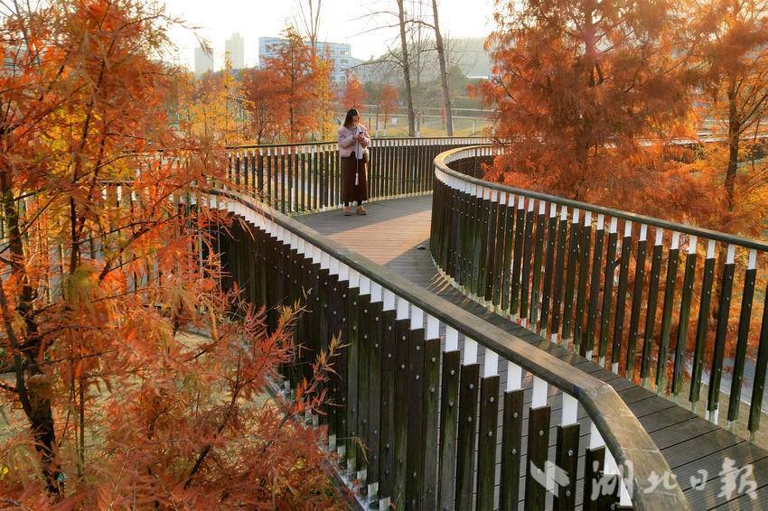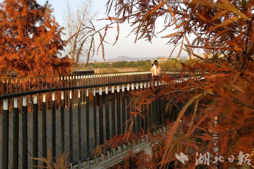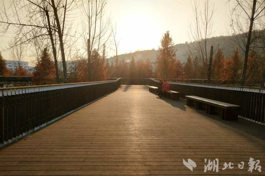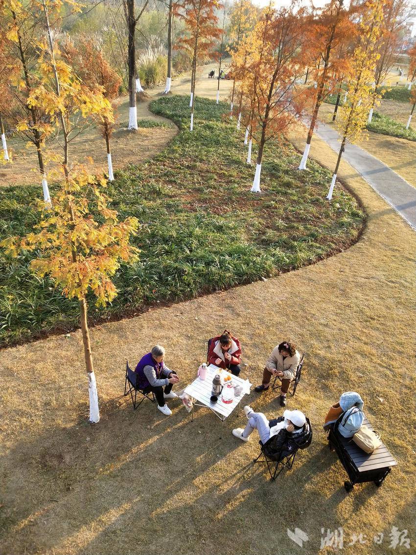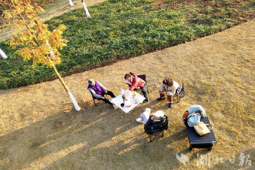 ↑ 2024年12月16日,游客在宜昌市夷陵区黄柏河湿地公园“沐浴”冬日暖阳下的休闲时光。