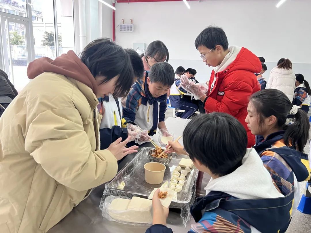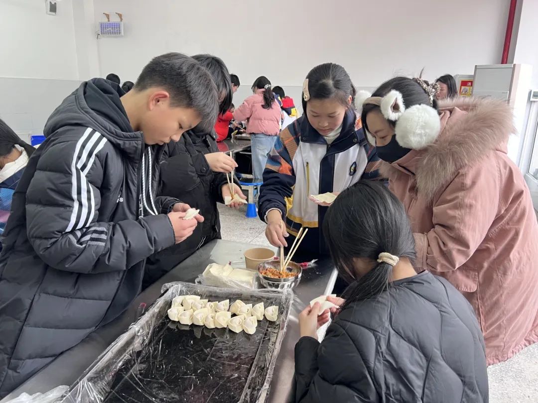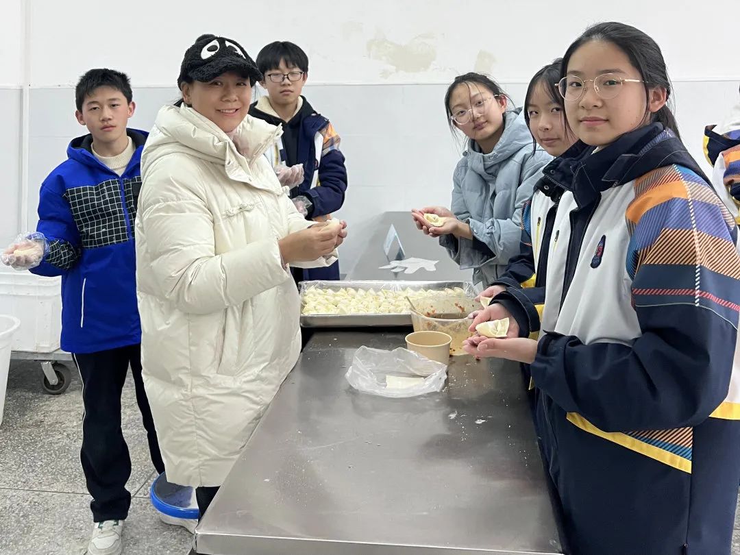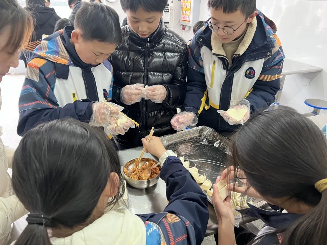 在冬至前一天,802班学生和家长、志愿者们一起在学校食堂包饺子、洗姜,虽有很多厨房“小白”,但每个人依旧以饱满认真的态度对待手上的一张张饺子皮,似乎想把所有的敬意都包在饺子里,尽他们所能让手中的饺子呈现出最完美的模样。