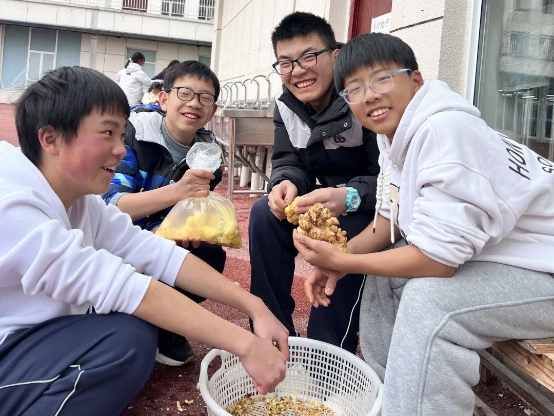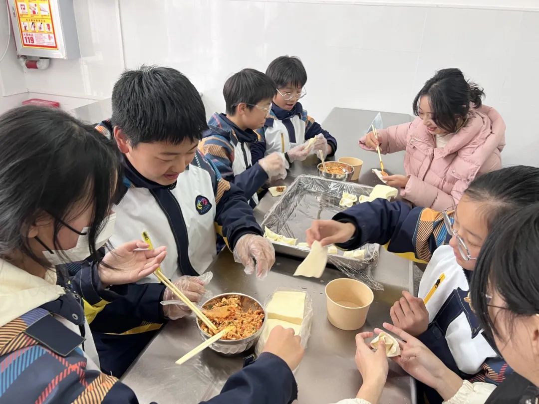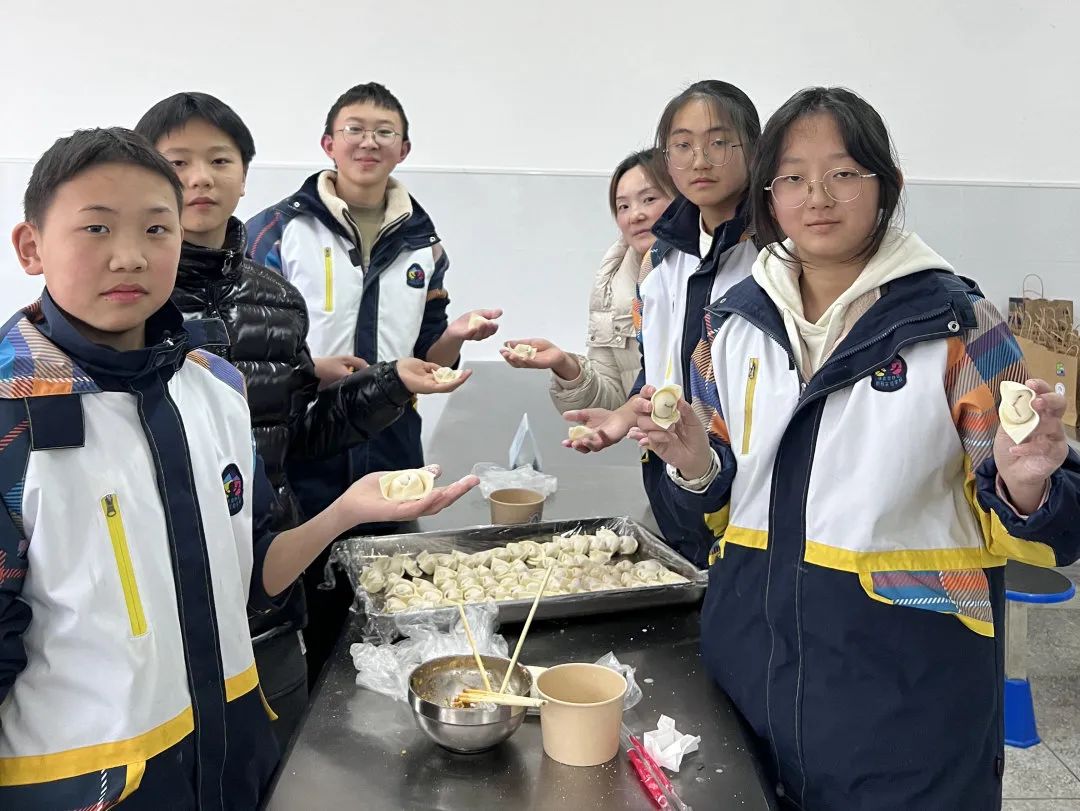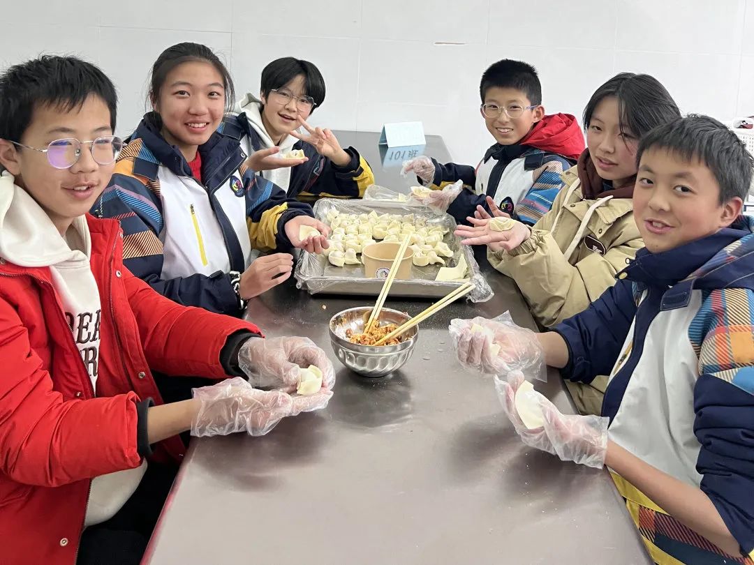 在冬至前一天,802班学生和家长、志愿者们一起在学校食堂包饺子、洗姜,虽有很多厨房“小白”,但每个人依旧以饱满认真的态度对待手上的一张张饺子皮,似乎想把所有的敬意都包在饺子里,尽他们所能让手中的饺子呈现出最完美的模样。