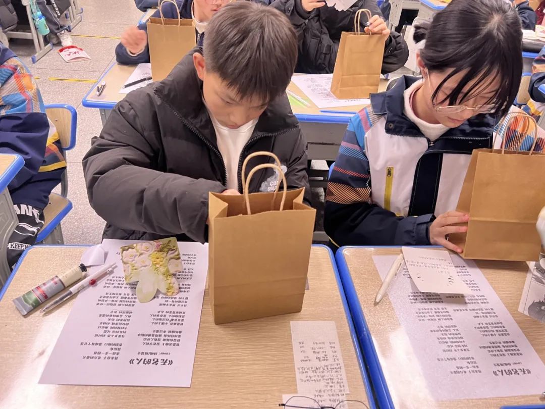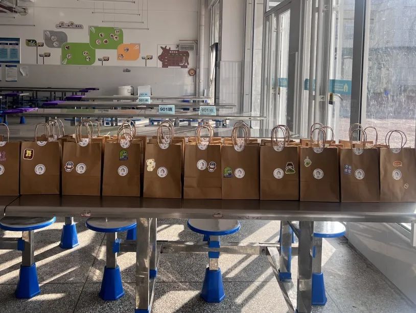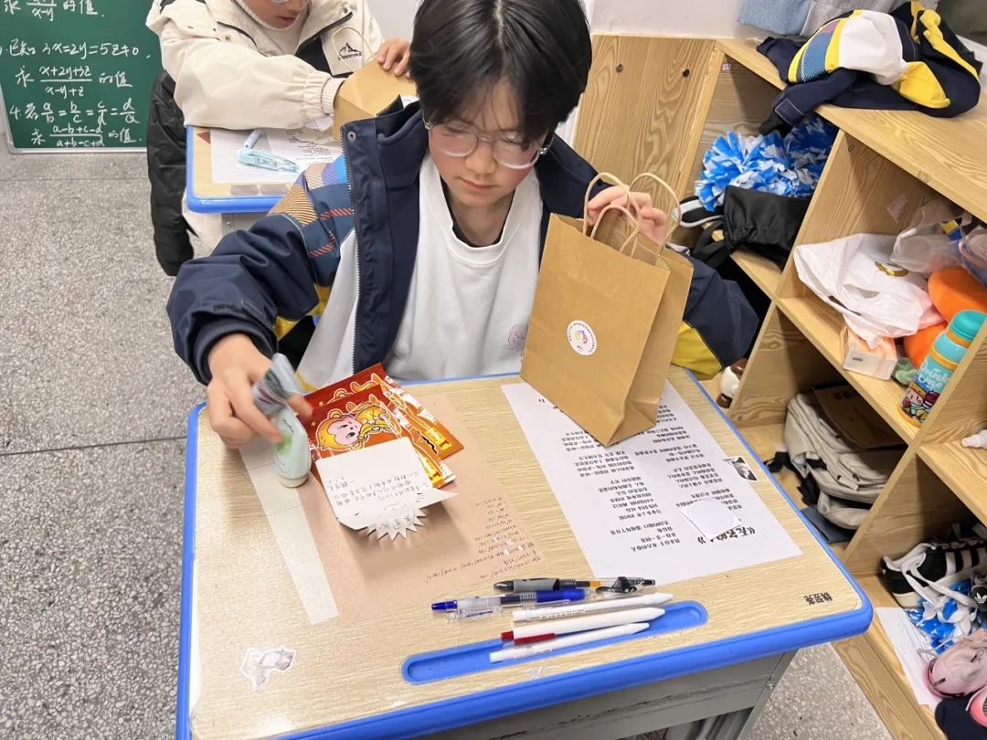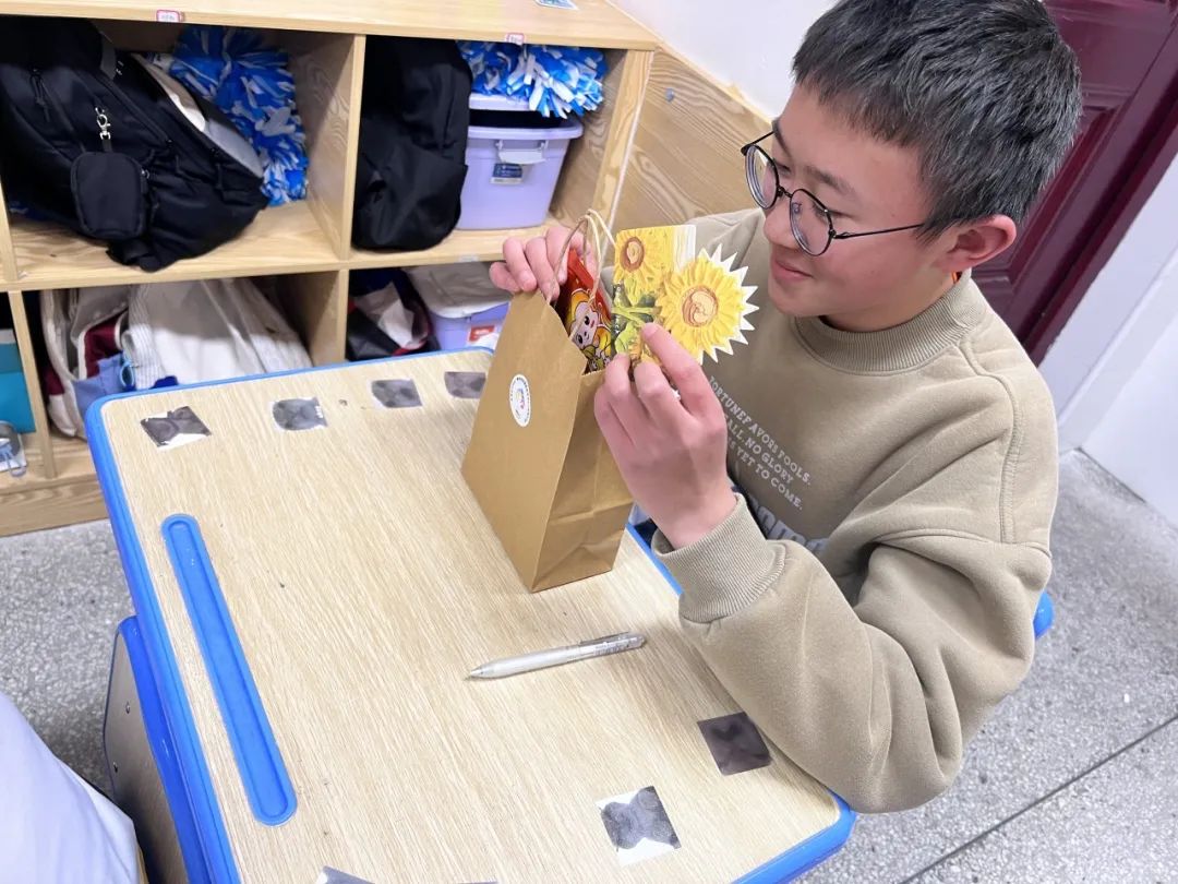 在准备阶段,学生们利用课余时间,给环卫工人写好了祝福贺卡,与准备好的暖贴、护手霜一起装入礼袋中。小小的礼物袋中承载着满满的温情。