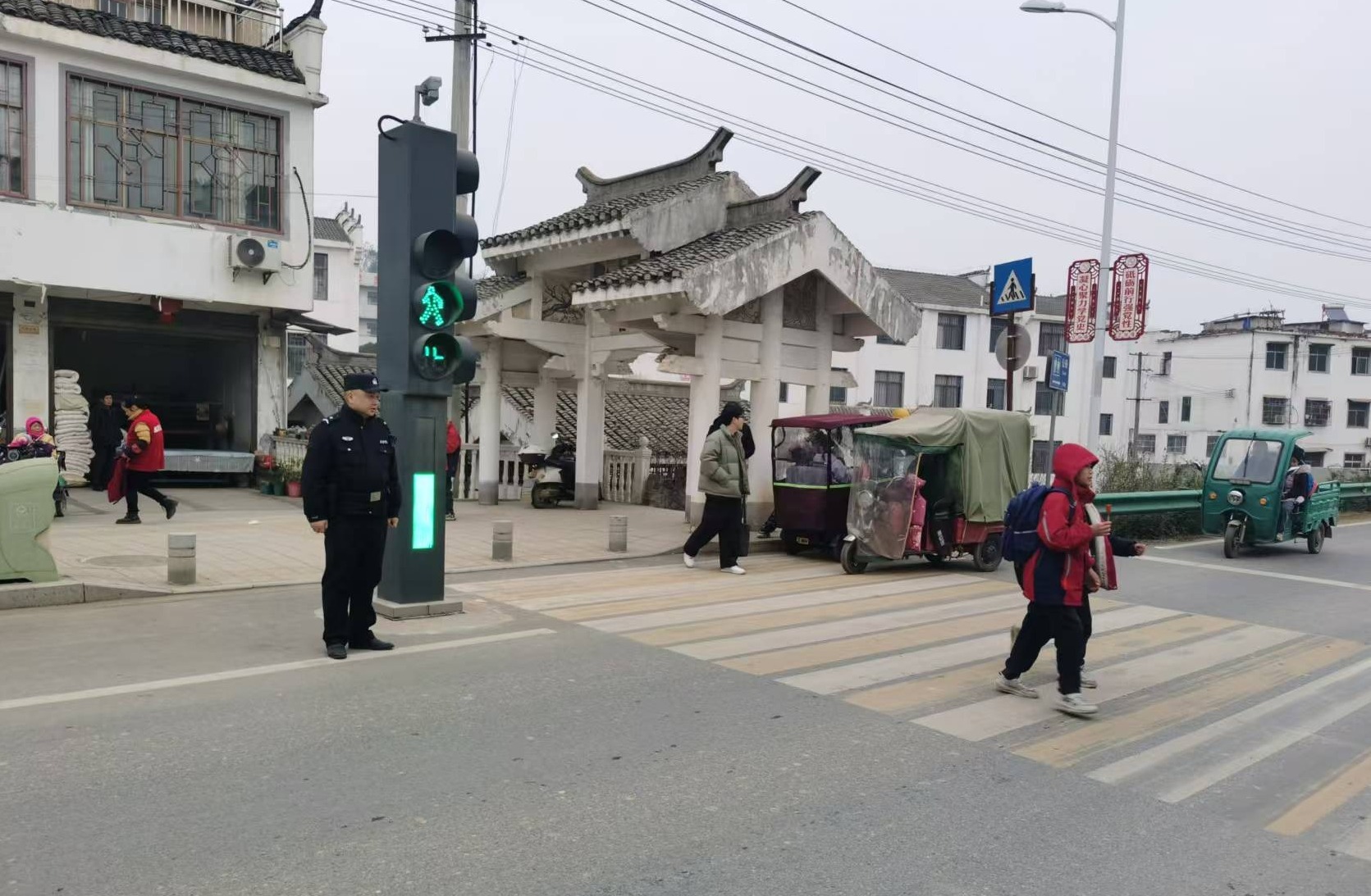 每天上学、放学的高峰时段,由汀泗桥镇镇干部、汀泗桥派出所民警、学校老师及安保人员组成的护学岗队伍准时到岗。镇干部、老师、安保人员在校门口引导学生有序排队入校、离校,提醒孩子们注意脚下安全,帮助低年级的学生背好书包,用温暖的笑容和亲切的问候迎接和送别每一位学生。派出所民警坚守在学校门口的主干道上,劝导过往车辆减速慢行、礼让行人,指挥接送学生的车辆即停即走,避免交通拥堵和混乱。同时,民警们密切关注校园周边动态,加强巡逻防控,对可疑人员和车辆进行排查,防范各类安全隐患,让学校师生和家长们倍感安心。