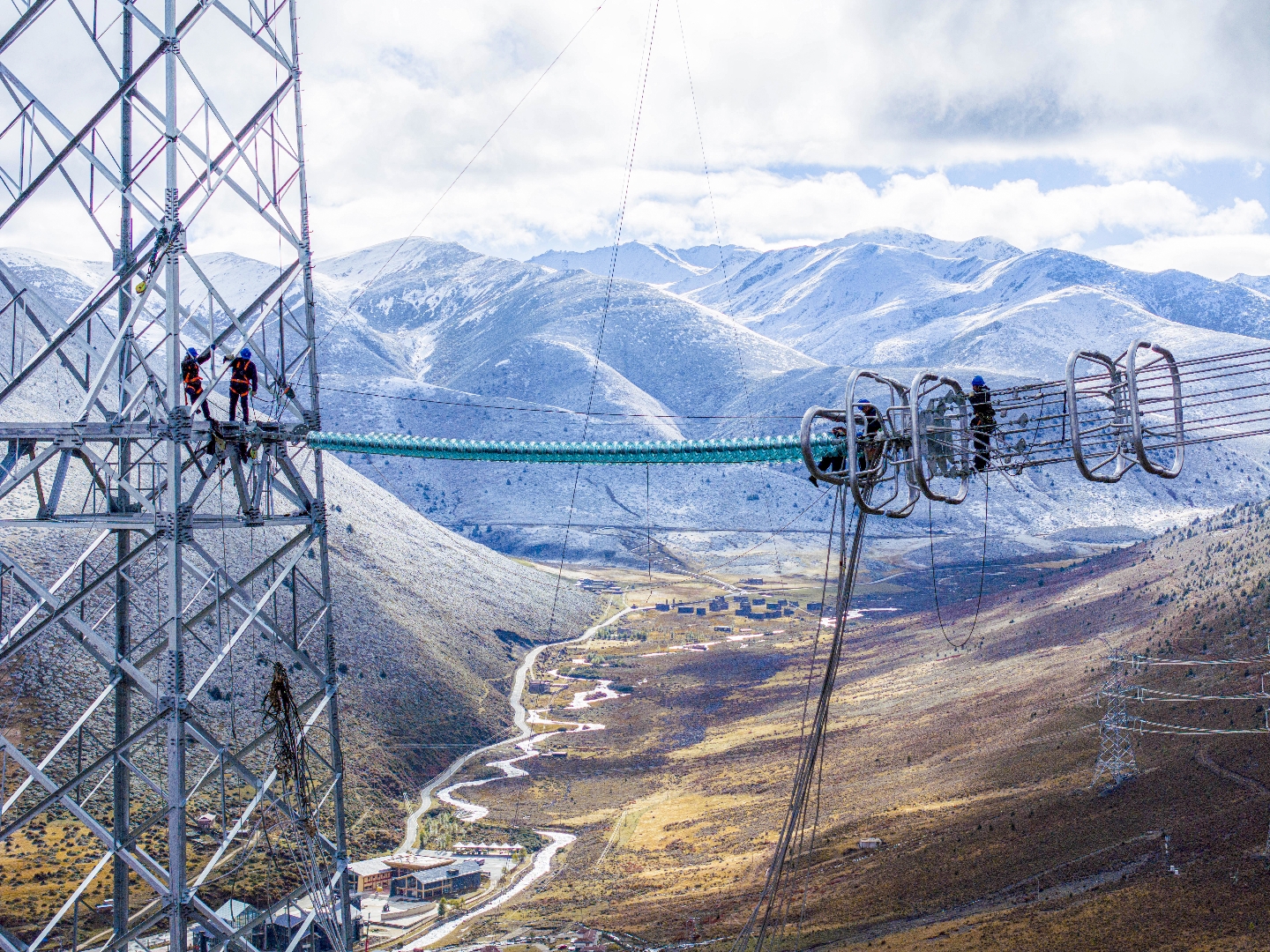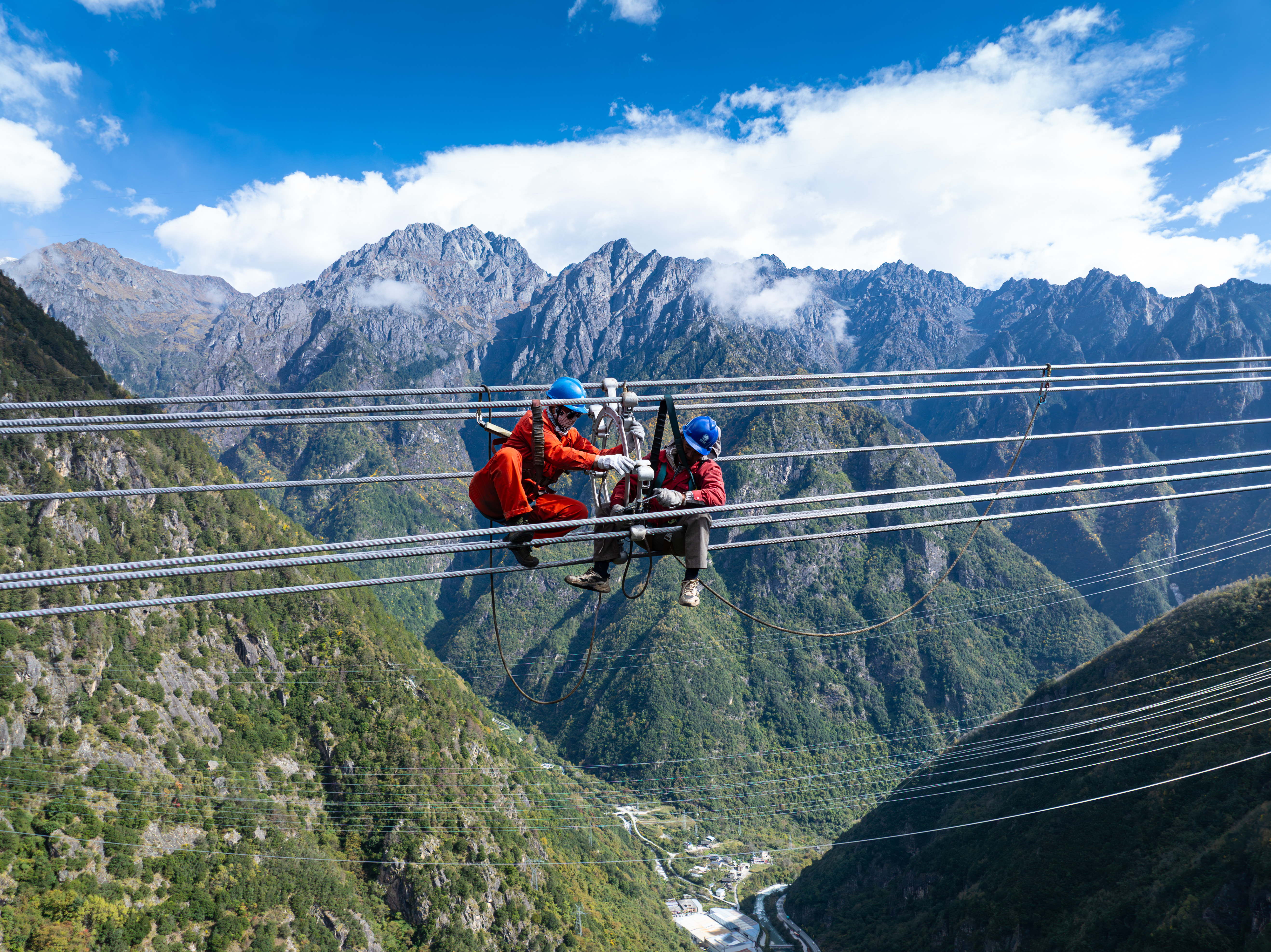 2024年10月20日,四川省甘孜州康定市小天都水电站附近,国网四川电力施工人员正在进行川渝特高压工程输电线路间隔棒安装作业。(曹颀 摄)