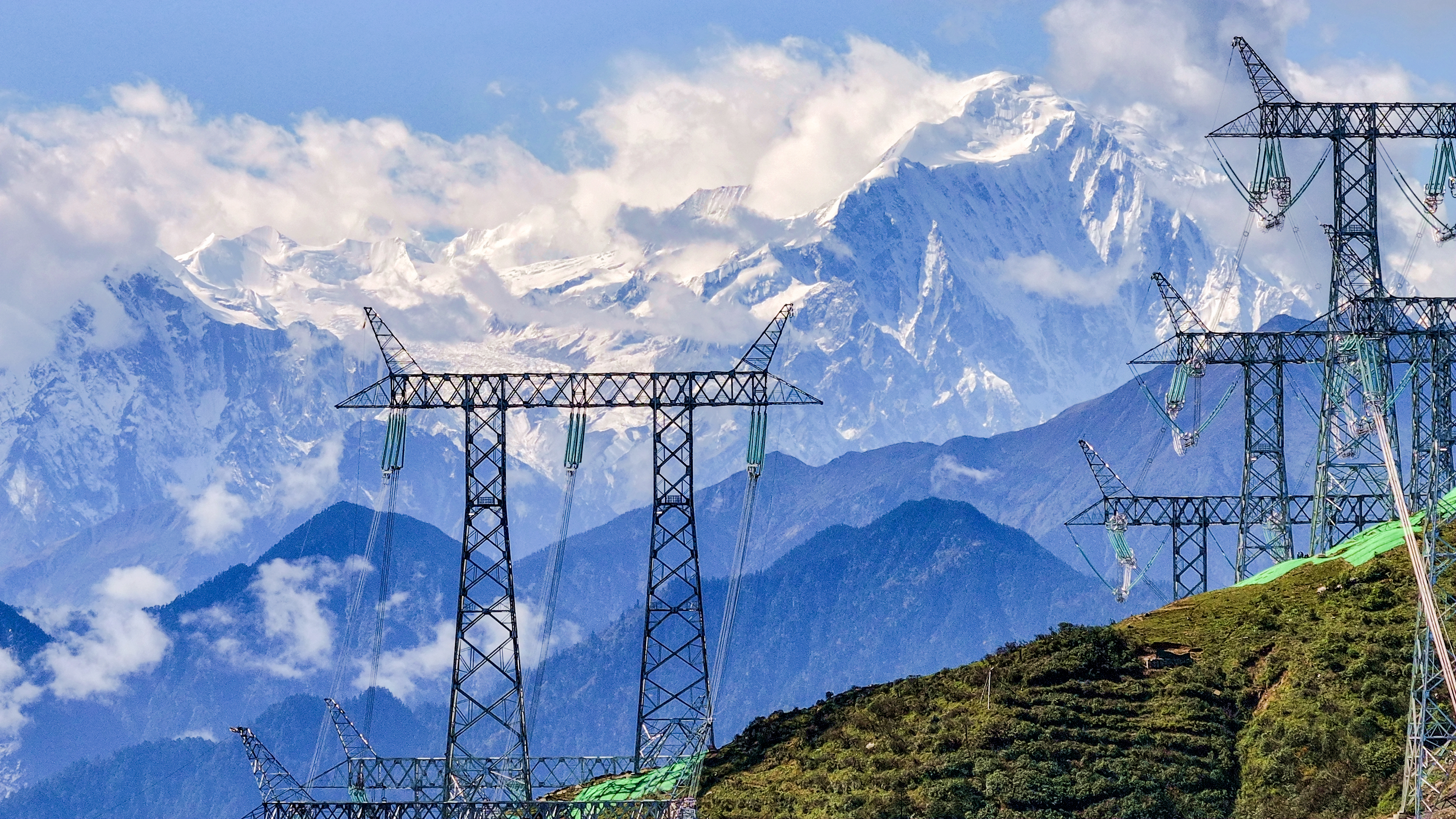 2024年10月23日,在四川泸定县二郎山上,川渝特高压门型塔区段“开门见山”(门型塔背后为贡嘎雪山)。(刘湘钒 摄)
