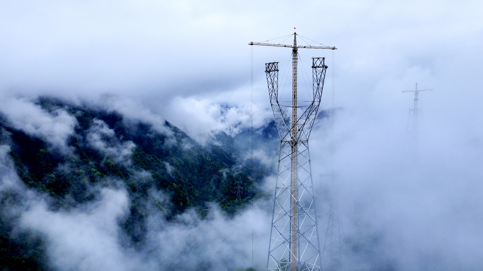 2024年6月3日,川渝特高压工程1000千伏输电线路飞越折多山,在70米高空,国网四川电力施工人员配合安装间隔棒及其附件。(陈欣 摄)