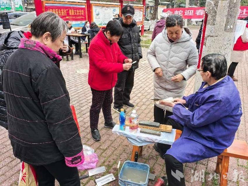 便民服务区同样热闹非凡,理发师手中的剪刀上下翻飞,为老人剪出干净清爽的发型;磨刀师傅用巧力转动砂轮,一把把钝刀重焕锋芒,贴心便民服务尽显温情。