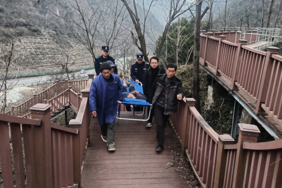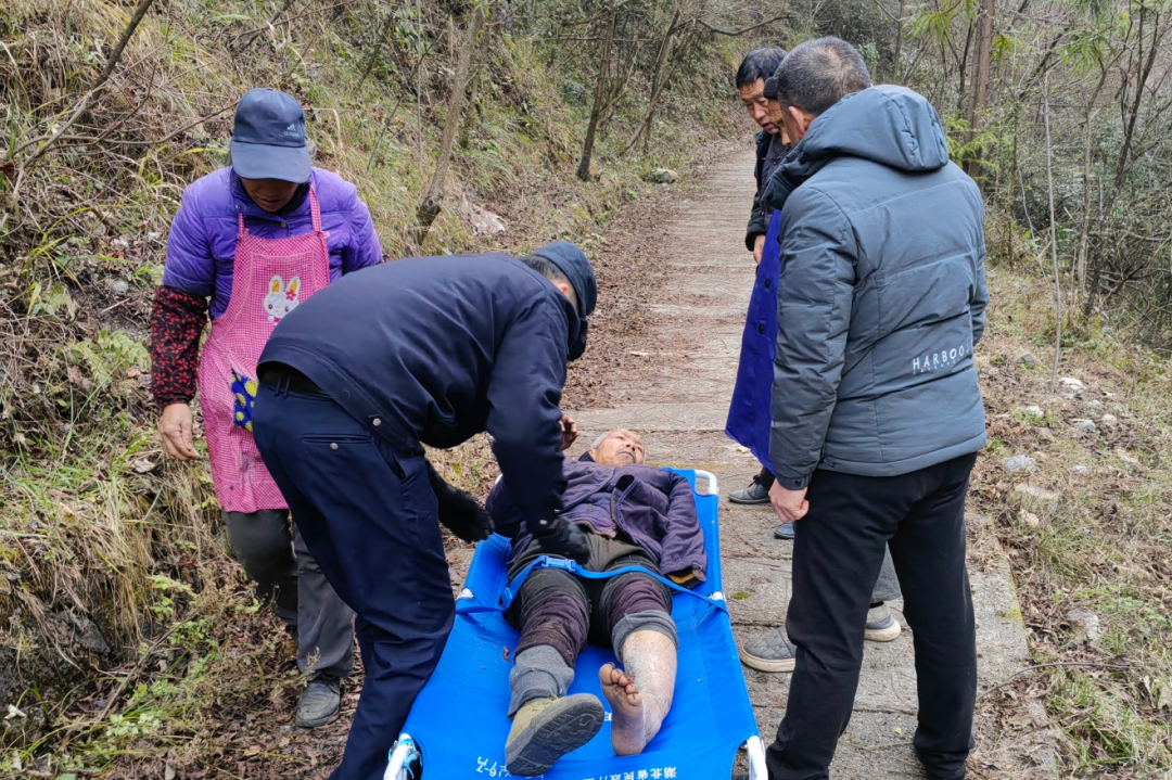 接警后,松柏派出所民辅警和当地村干部火速赶到现场处置。发现摔倒的老人系龙沟村尚某后,民警立即联系其家属,初步判断尚某是从步游道上方树林意外滑落,造成身体多处受伤,疑似小腿骨折。