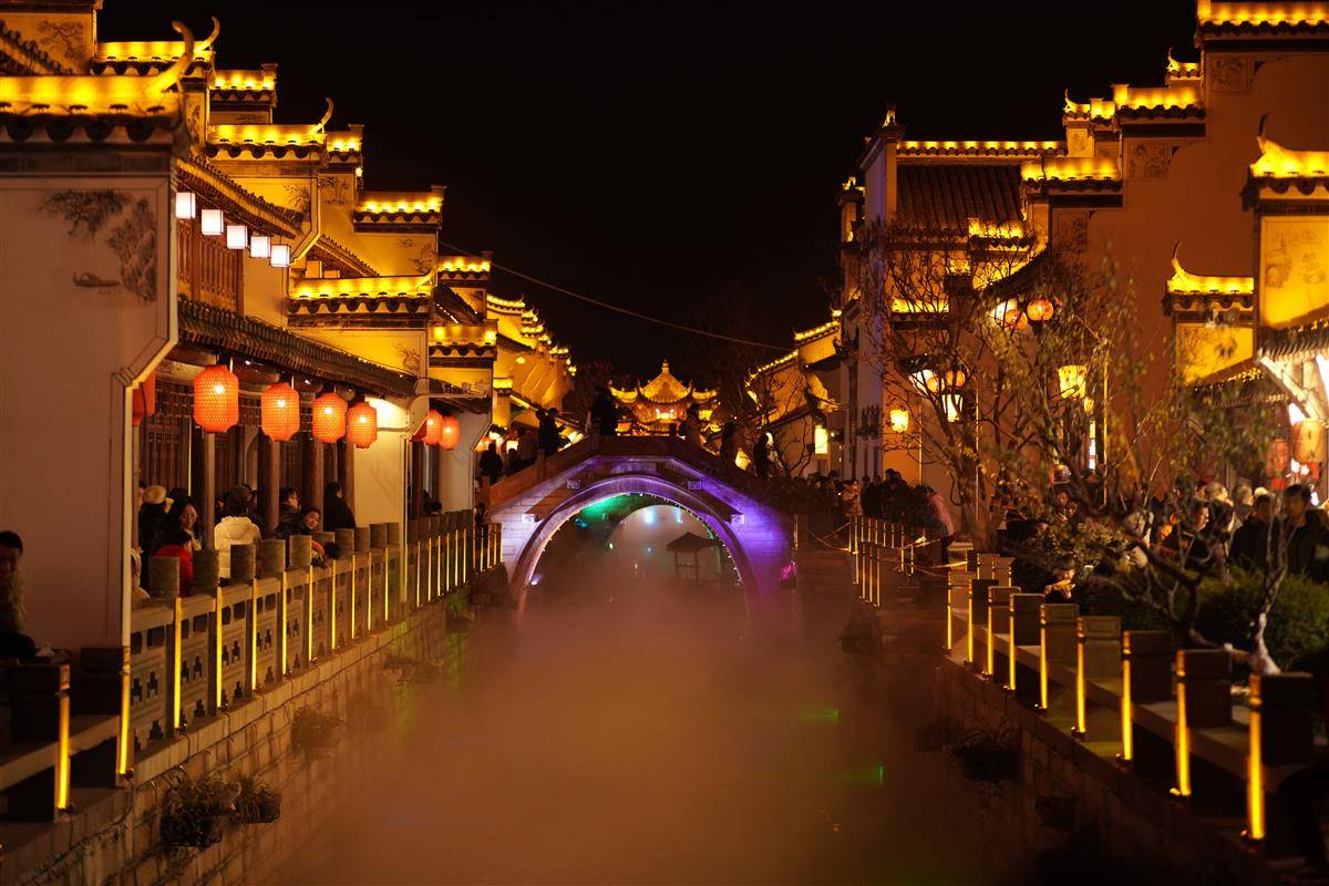 云梦老街由330米旱街和330米水街组成,南有钟楼、北有鼓楼,复原迁建古建筑113栋、店铺236间,入驻有特色美食馆、文创产品馆、休闲购物商铺和民宿客栈等,形成一条老街、两宗祠堂、三大牌坊、四套合院、五组骑楼、六座古桥、七个码头、八栋花厅、九条老巷的景观格局。当天,不少身着汉服的女孩漫步街头、游园赏灯,仿佛穿越到千年前。