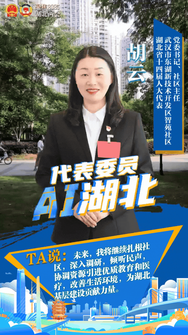 湖北是楚韵悠长的文化厚土,鱼米满仓的富饶水乡,更是宜居宜家宜业的幸福家园。未来,我将继续扎根社区,深入调研,倾听民声,整理形成高质量议案和建议,推动政策法规精准解读并向居民传达,组织普法、志愿者服务等活动,协调各方资源引进优质教育、医疗等资源,改善生活环境,提升生活品质,不负选民的信任,在省人大代表的岗位上为湖北的基层建设贡献自己的力量。