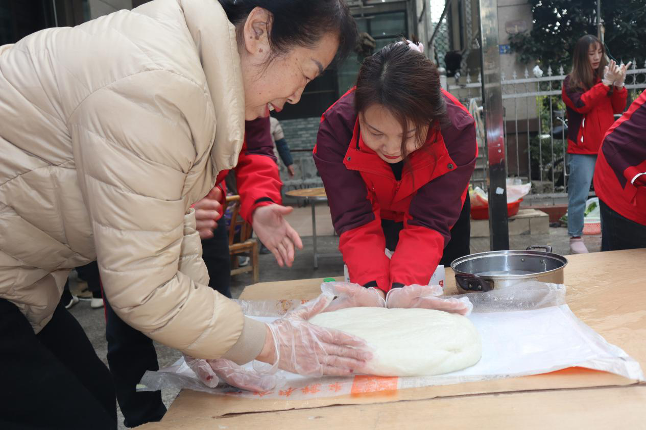 上午10点,小区居民纷纷前来帮忙,大家分工合作,把浸泡好的糯米捞起、沥干水分、蒸熟,“小时候的记忆里,在过年的时候吃上一块热乎乎的糍粑,山珍海味都不换……”在默契配合下,香喷喷的糍粑雏形渐渐展现,院内弥漫着一片热闹祥和的气氛。