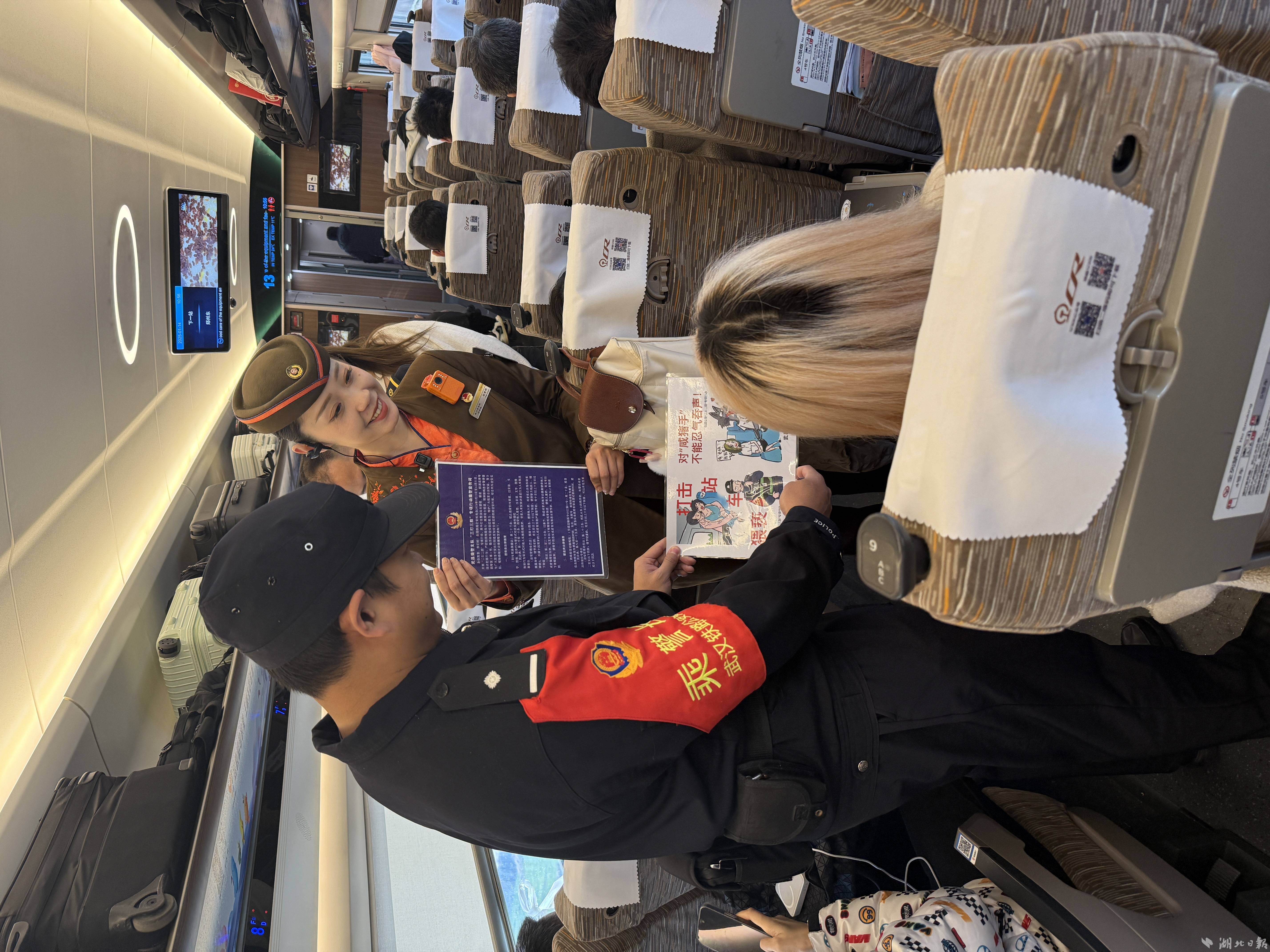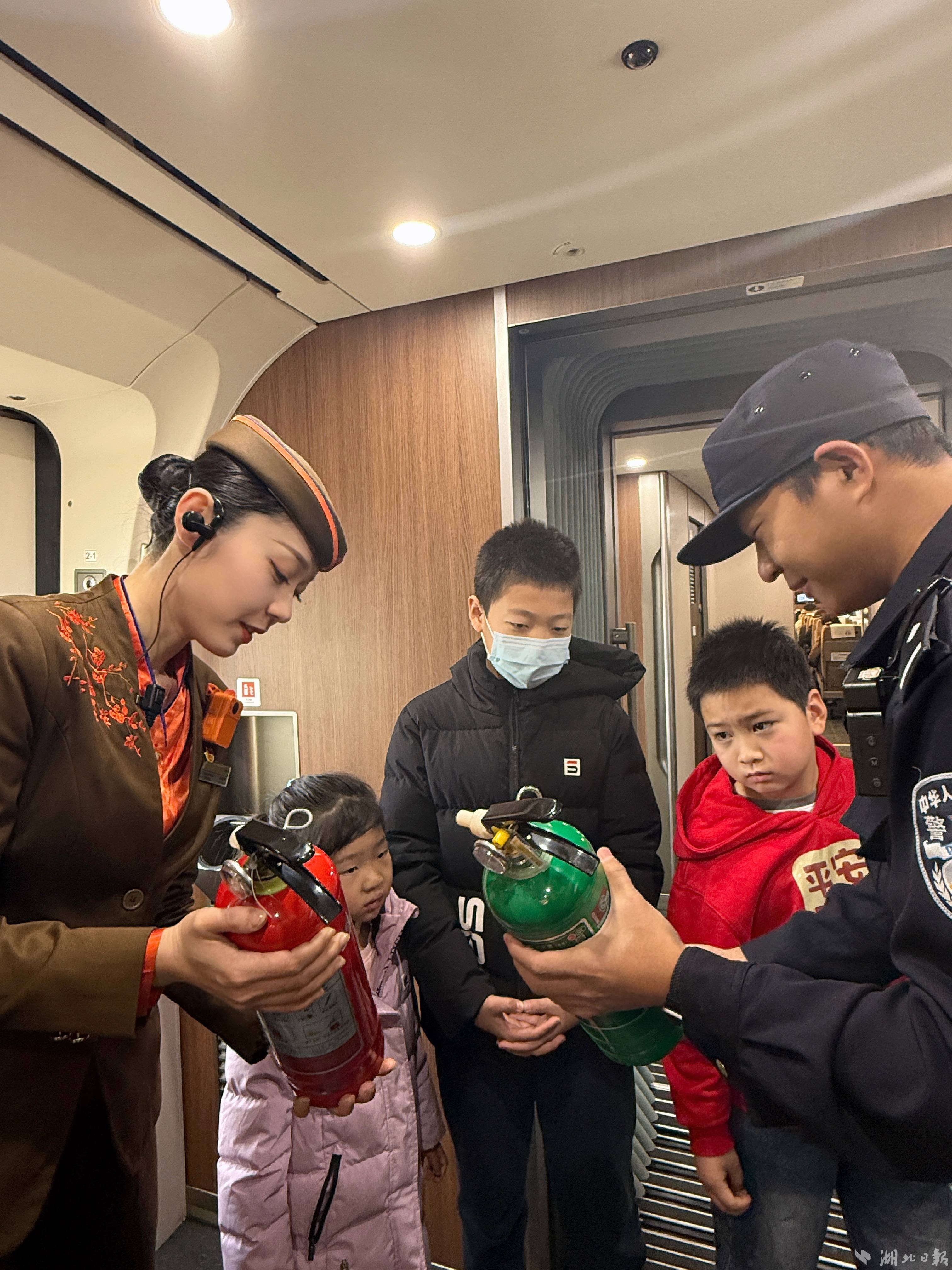 在北京开往武汉方向的G67次列车上,乘警与列车长谷金韩拿着安全宣传手册在车厢内进行讲解,宣传出行安全知识。“春节出行,大家携带的行李较多,一定要把行李放在行李架上合适的位置,避免掉落砸伤自己和他人。”在车厢风挡处,他们还为几位小朋友和家长进行车厢内设备设施及消防安全的讲解。