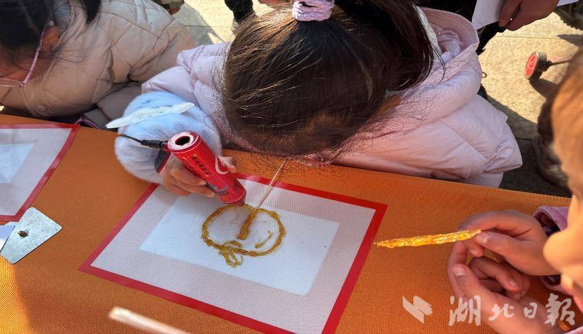 活动现场,小朋友们的游乐天地尤为热闹。爆米花机与冰糖葫芦摊位前,小朋友们排起了长队,期待着品尝美味零食。糖画师傅的摊位更是被围得水泄不通,栩栩如生的动物糖画引得小朋友们阵阵惊叹,欢声笑语回荡在空气中。