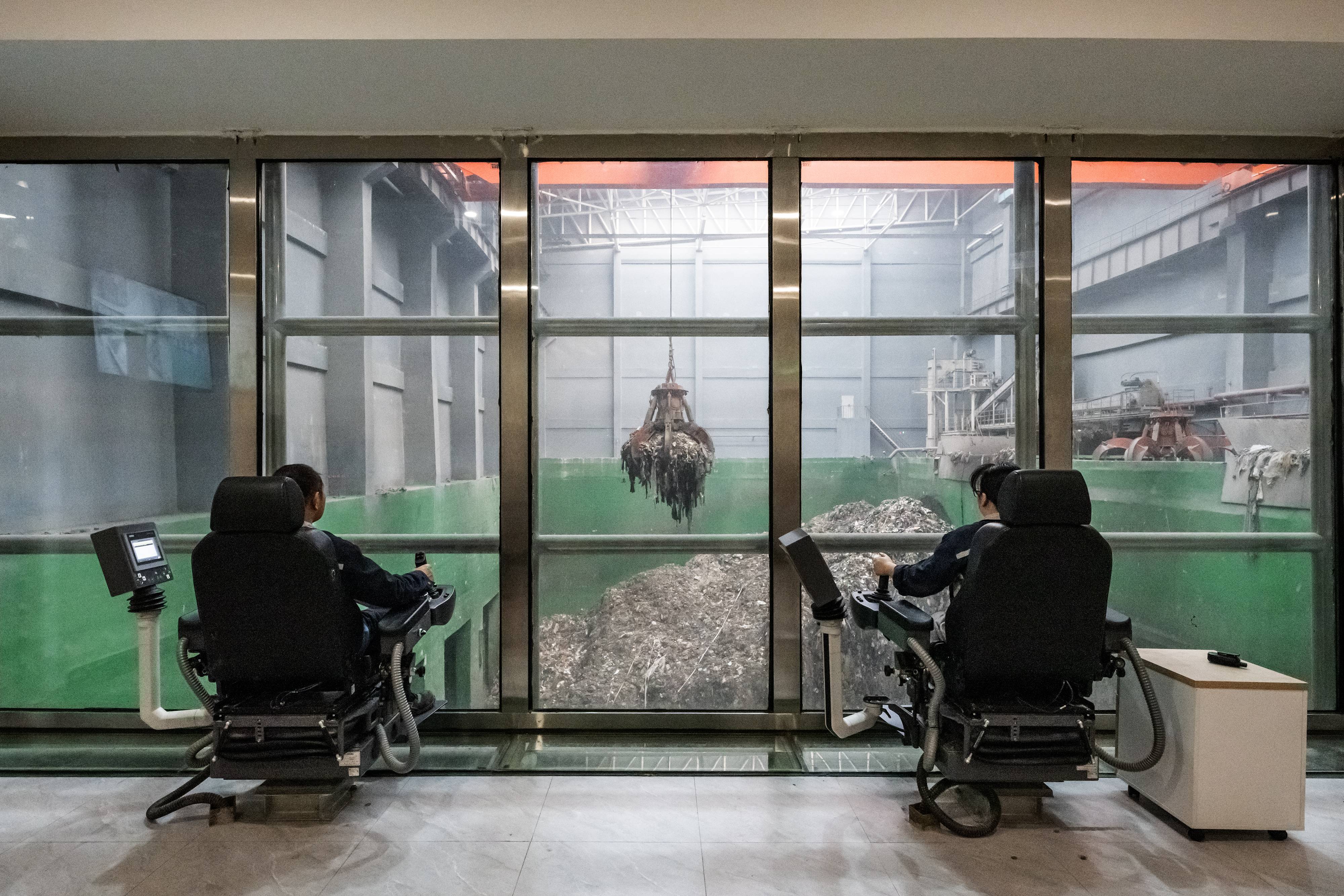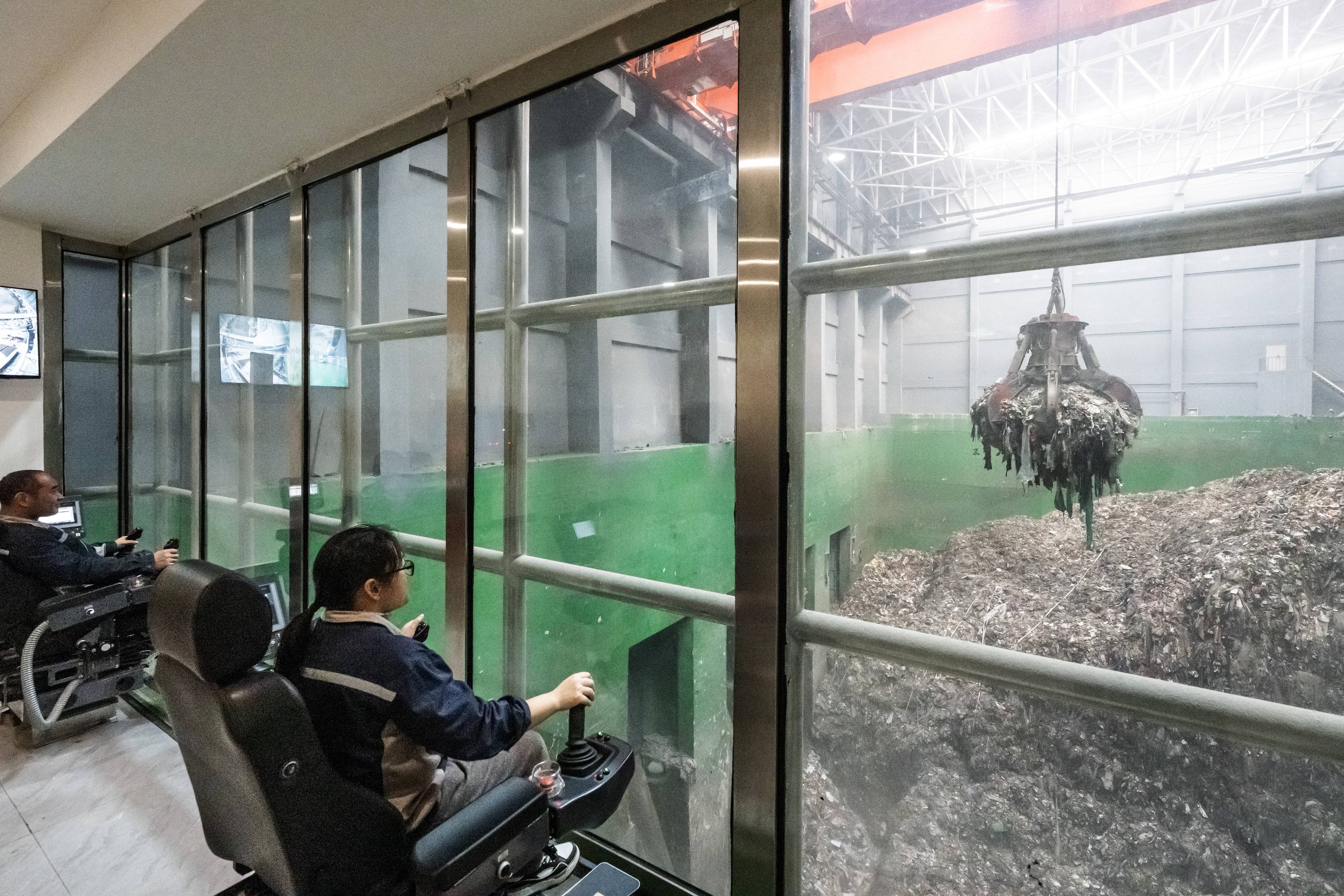 工作人员操作巨型抓斗,将生活垃圾投进机械炉排焚烧炉内。 (湖北日报全媒记者 任勇 摄)