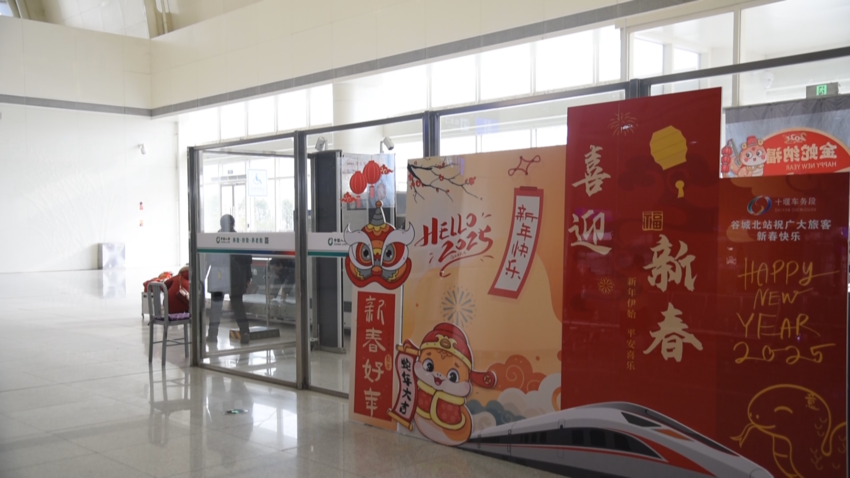 上午10点多钟,记者在谷城北高铁站看到,喜迎新春的展牌、福字以及新年快乐的贴画,将候车大厅装饰一新,营造出浓浓的年味,进站的旅客一拨接着一拨。在进站口、安检处、扶梯口等主要通道,随处可见工作人员和铁路民警的身影。