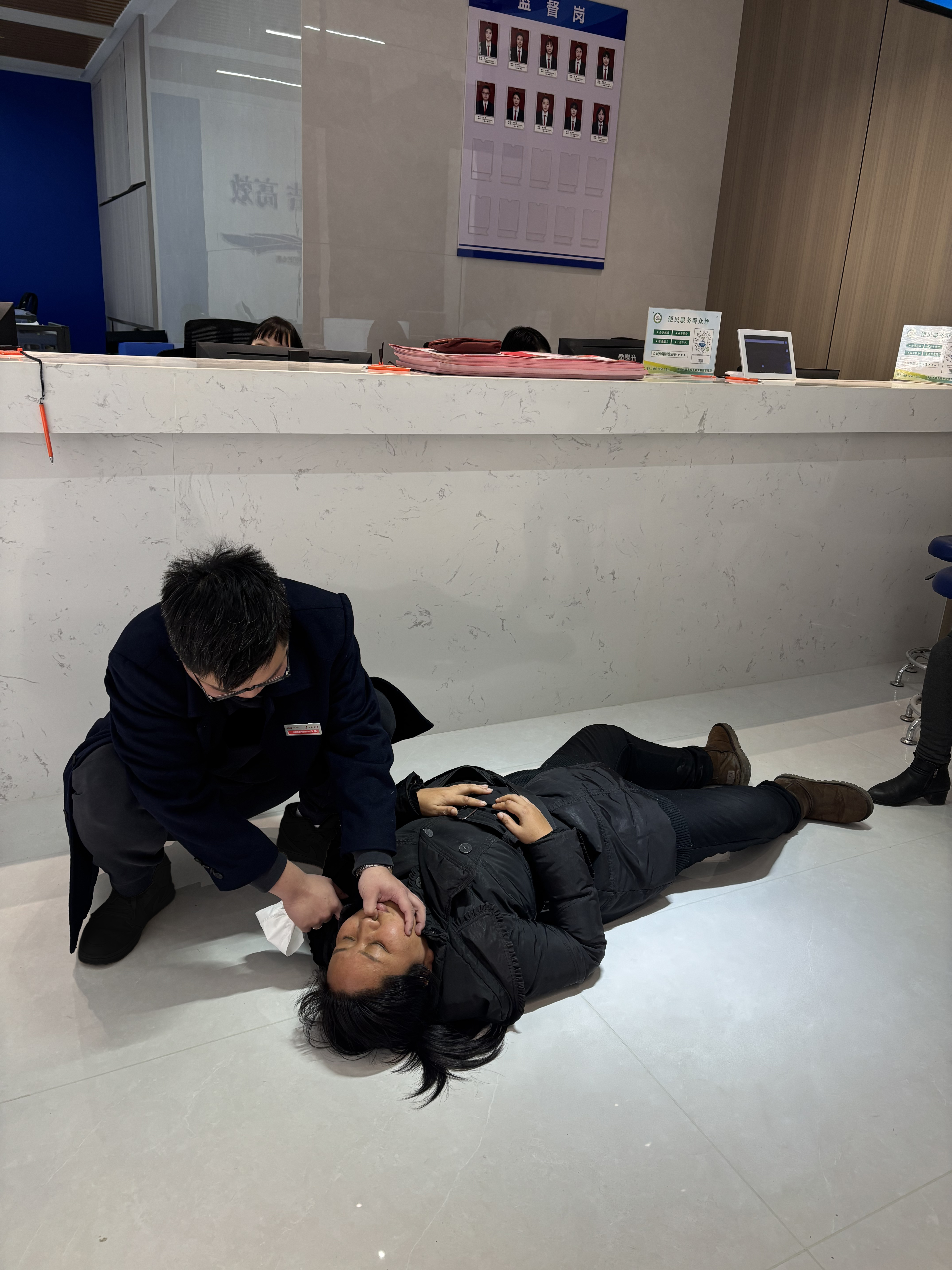 湖北日报客户端讯(通讯员石晓)16日上午,一名来阳新县兴国镇便民服务中心办事的群众突发癫痫晕倒在地,现场工作人员石晓看见后迅速做出反应,确定群众病因后紧急展开急救措施。