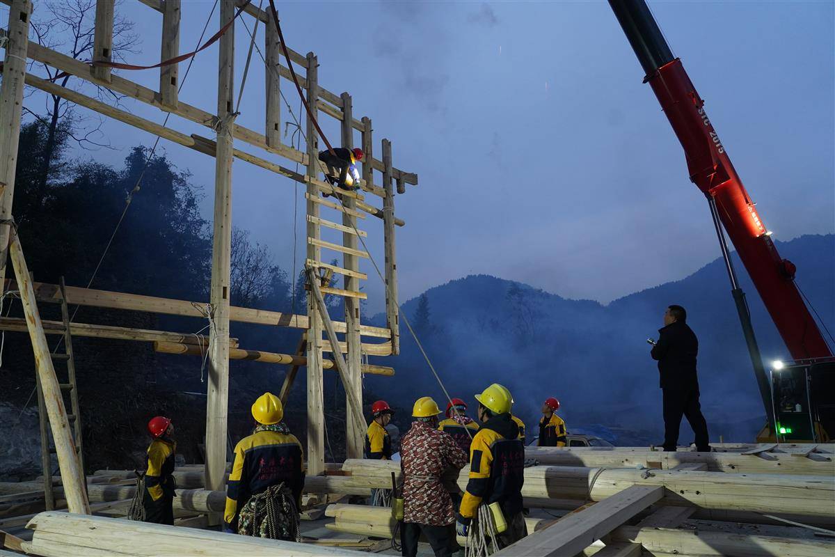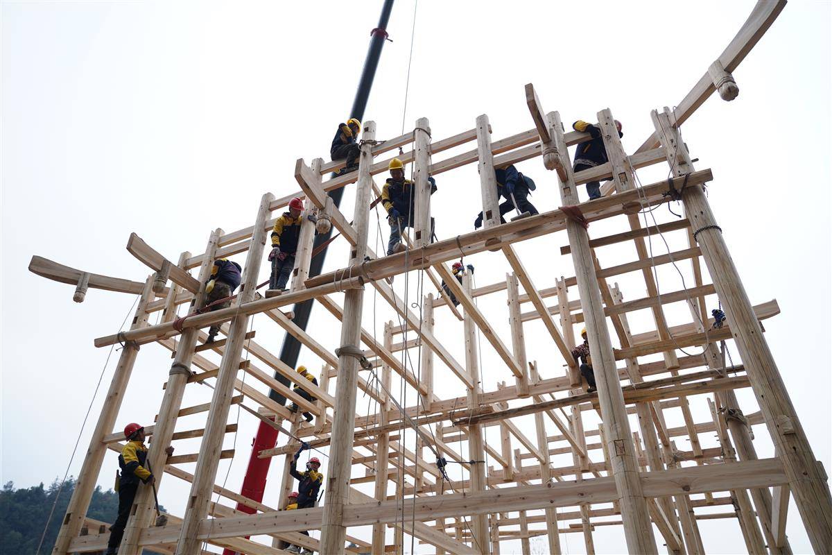 伴着整齐的号子,皮肤黝黑、个子不高的贺茂宣指挥着施工队,十多米高的吊脚楼框架拔地而起。