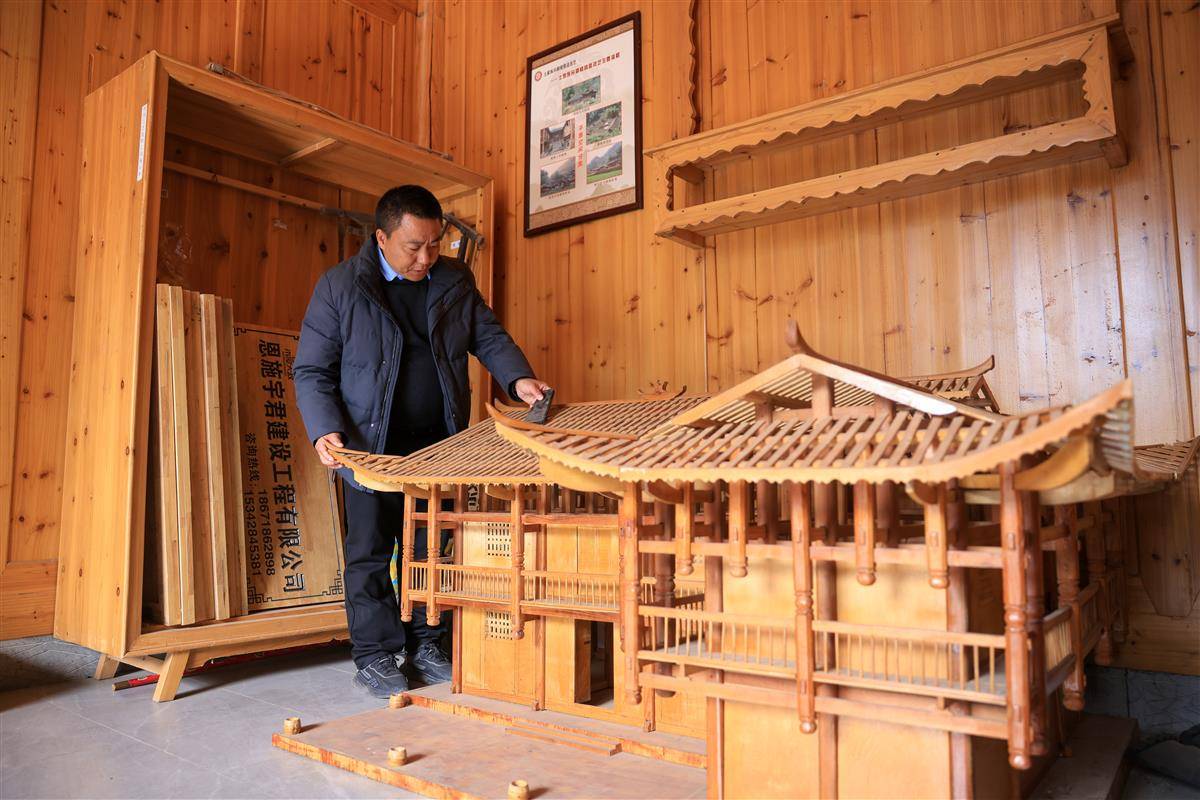 贺茂宣介绍土家吊脚楼模型。 (湖北日报全媒记者 鲁腾 通讯员 杜迪纳 摄)