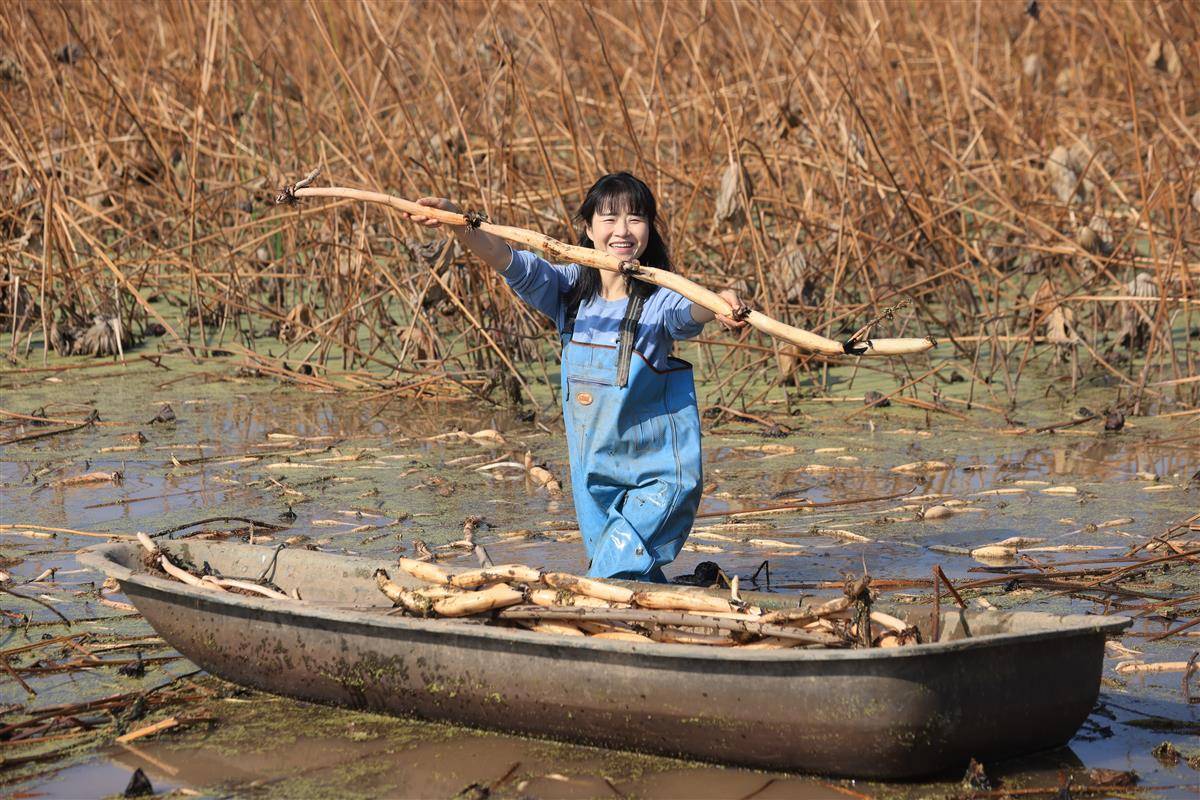 桂婳在藕塘里展示刚挖出来的野藕。 (湖北日报全媒记者 柯皓 通讯员 陈可心 摄)