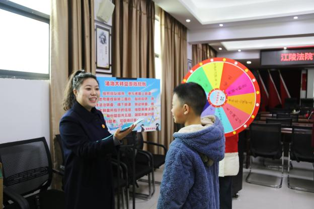 干警们根据小朋友的年龄特征定制了独家法治教育方案。将民法典、刑法、未成年人保护法等相关知识汇集,开发出了“法治大转盘”等小游戏,让小朋友在游戏中受到法治教育的滋养。