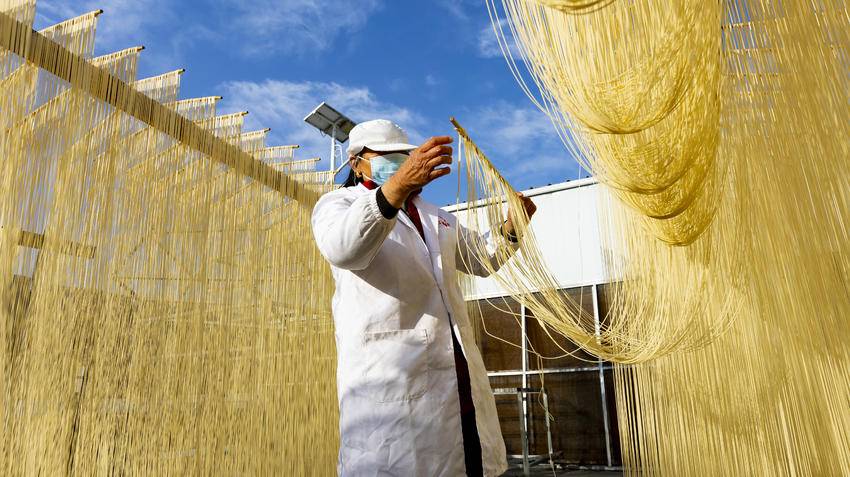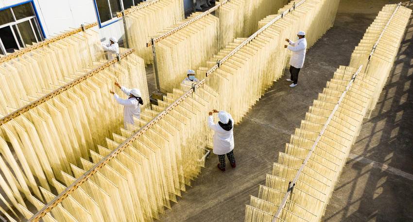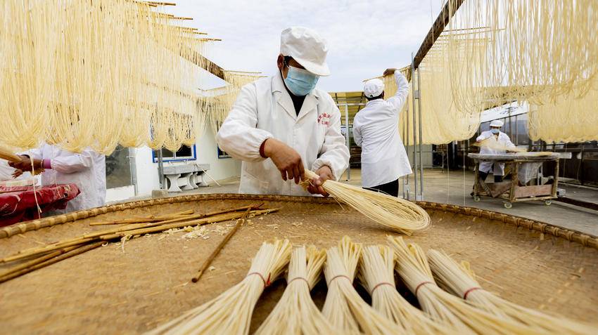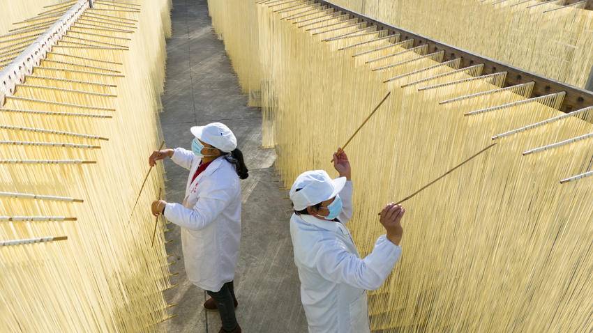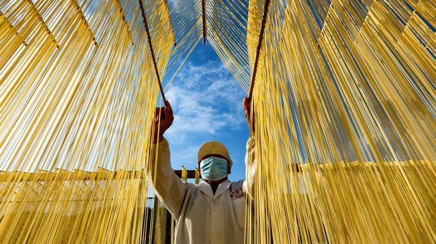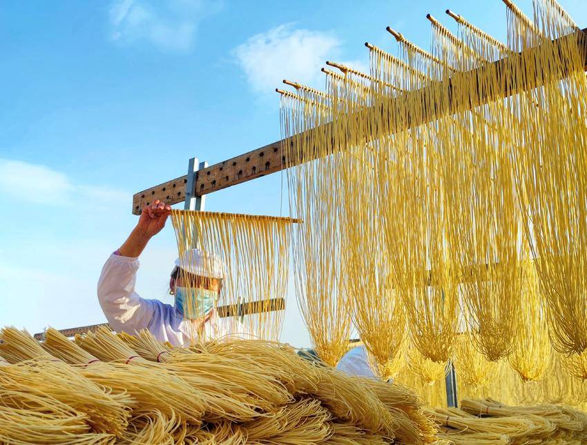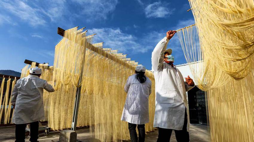 1月20日,湖北省英山县金家铺镇黄林冲村人在抢抓晴好天气“忙年”手工油面,供应春节市场。(湖北日报客户端通讯员孙严)