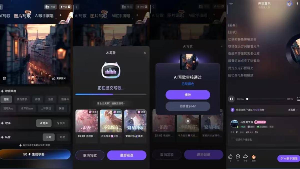 这个社交软件除了记录用户声纹信息,用算法合成以用户声音翻唱歌曲外,还可用AI生成歌曲,不仅输入歌词或歌曲标题可生成歌曲,甚至上传一张图片,也能生成一首歌曲。同时,还可生成AI主持人、MV等功能,而演唱房间则是典型的社交场所。喜欢唱歌的人可以在这个App里,找到志同道合的人。