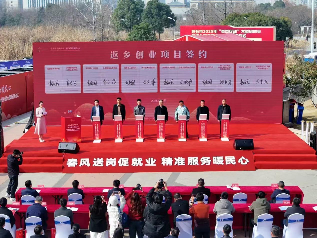 湖北日报客户端讯(通讯员陈蓓)1月21日,黄石市2025年“春风行动”大型招聘会暨返乡就业创业暖心服务活动启动仪式在阳新县莲花湖湿地公园举行。当天京磁智能厨电、众源鞋业、沐丰源米制品、佳南豆制品、普江大洋管业、开邦茶叶加工设备等六个返乡创业项目进行了现场签约。这次启动仪式共吸引近万名求职者进场,达成就业意向2937人。