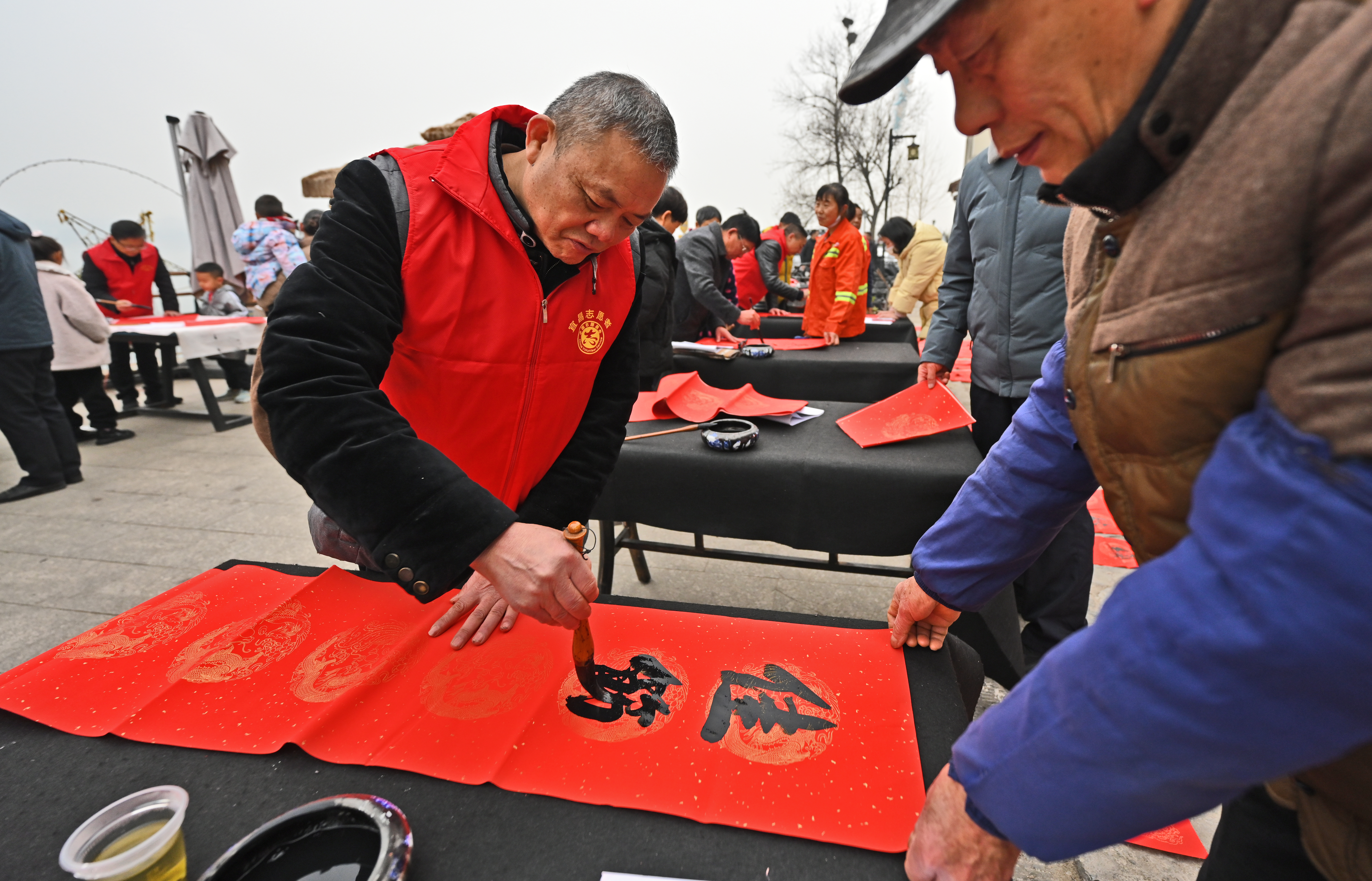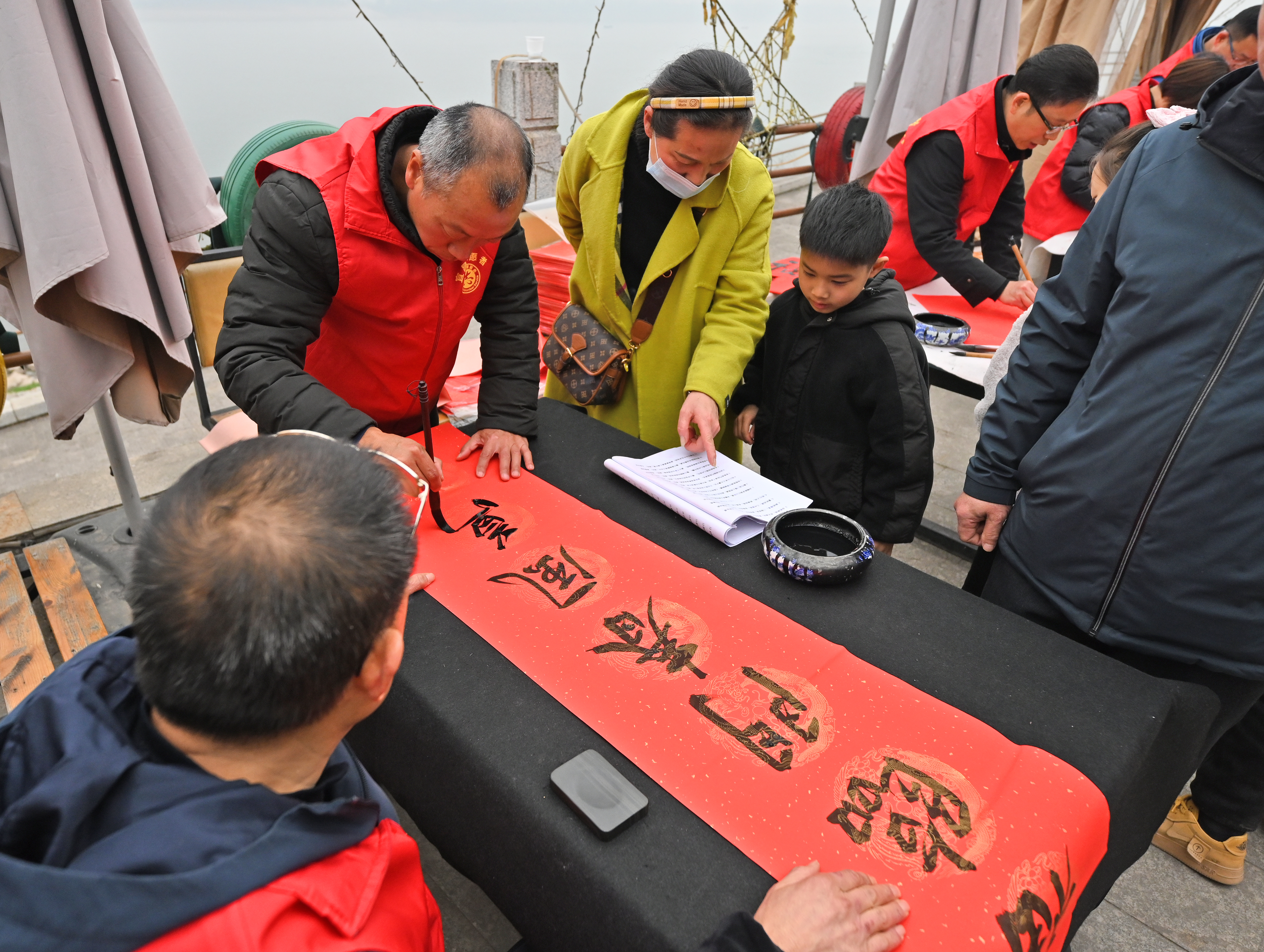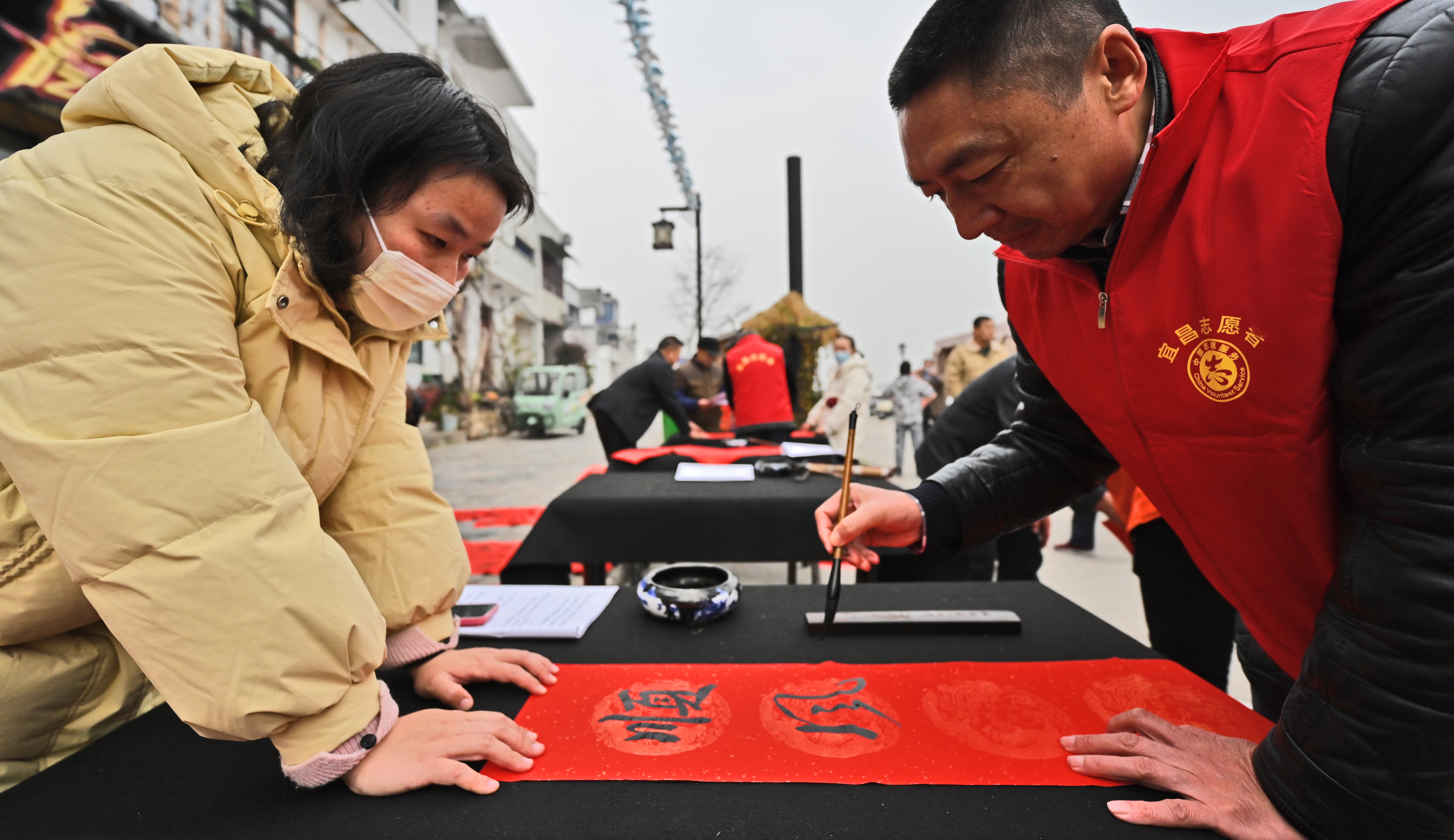 1月22日上午,宜昌市猇亭区古老背街道织布街码头人头攒动,当地“巳事如意·万福迎春”写春联送祝福文化惠民活动正在这里开展。书法爱好者、文艺志愿者们现场挥毫泼墨,为附近的居民送上春联、福贴,大红的春联映衬出浓浓的年味。