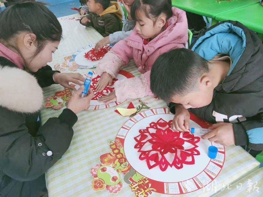 安全教育结束后,爱心妈妈与孩子们围坐一起,共同体验非遗剪纸活动。彩纸翻飞,银剪舞动。不一会儿,一幅幅灵巧精致、寓意吉祥的剪纸窗花在大朋友小朋友手中呈现,为即将到来的新春佳节增福添喜。这一环节不仅让孩子们锻炼了动手实践能力,还学习到了传统的民间艺术。