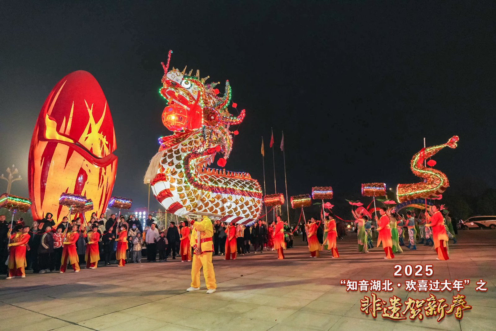 1月22日晚,知音湖北·2025欢喜过大年系列之“非遗贺新春”活动在潜江市启幕。蔡甸区省级非遗项目南湖高龙精彩亮相。