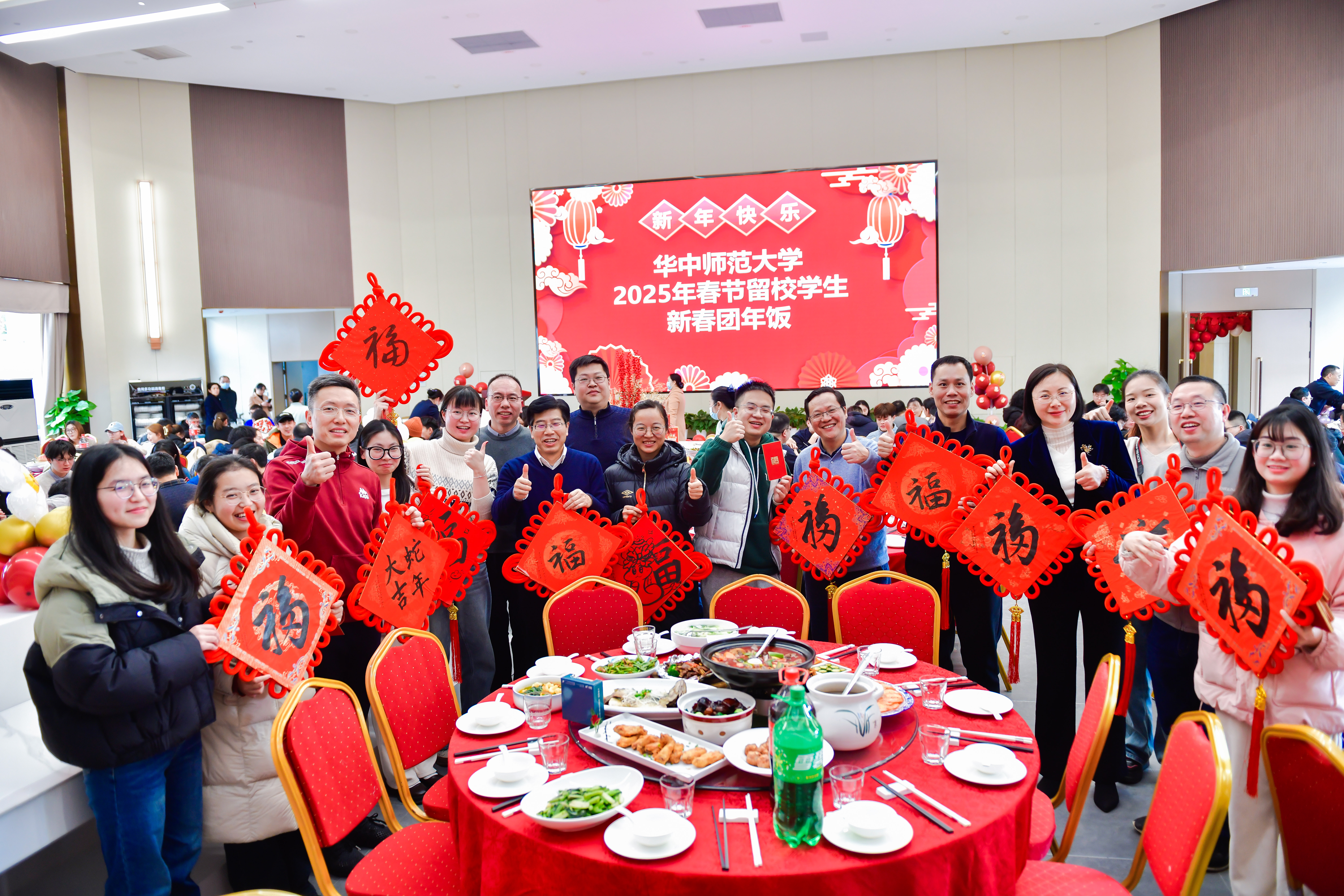 团年饭现场,该校校长彭双阶、党委副书记陈迪明,各院系的辅导员与160多名留校学生举杯欢庆,共同迎接蛇年新春的到来。