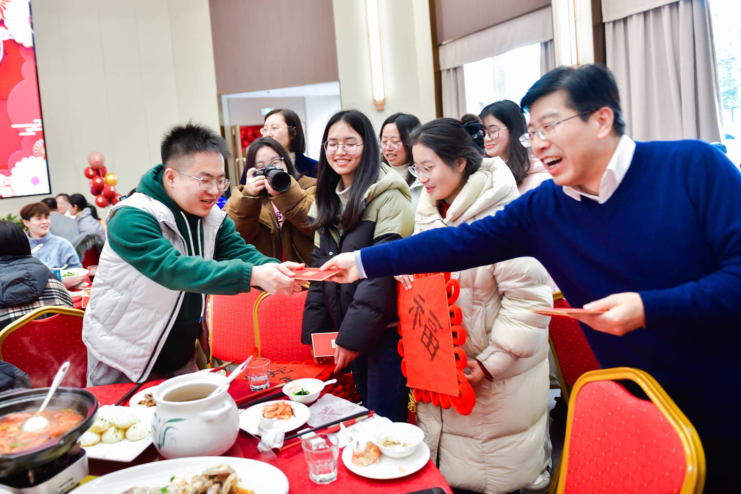 在一阵欢庆声中,校领导为现场每名留校学生送上新年红包,致以新春祝福。