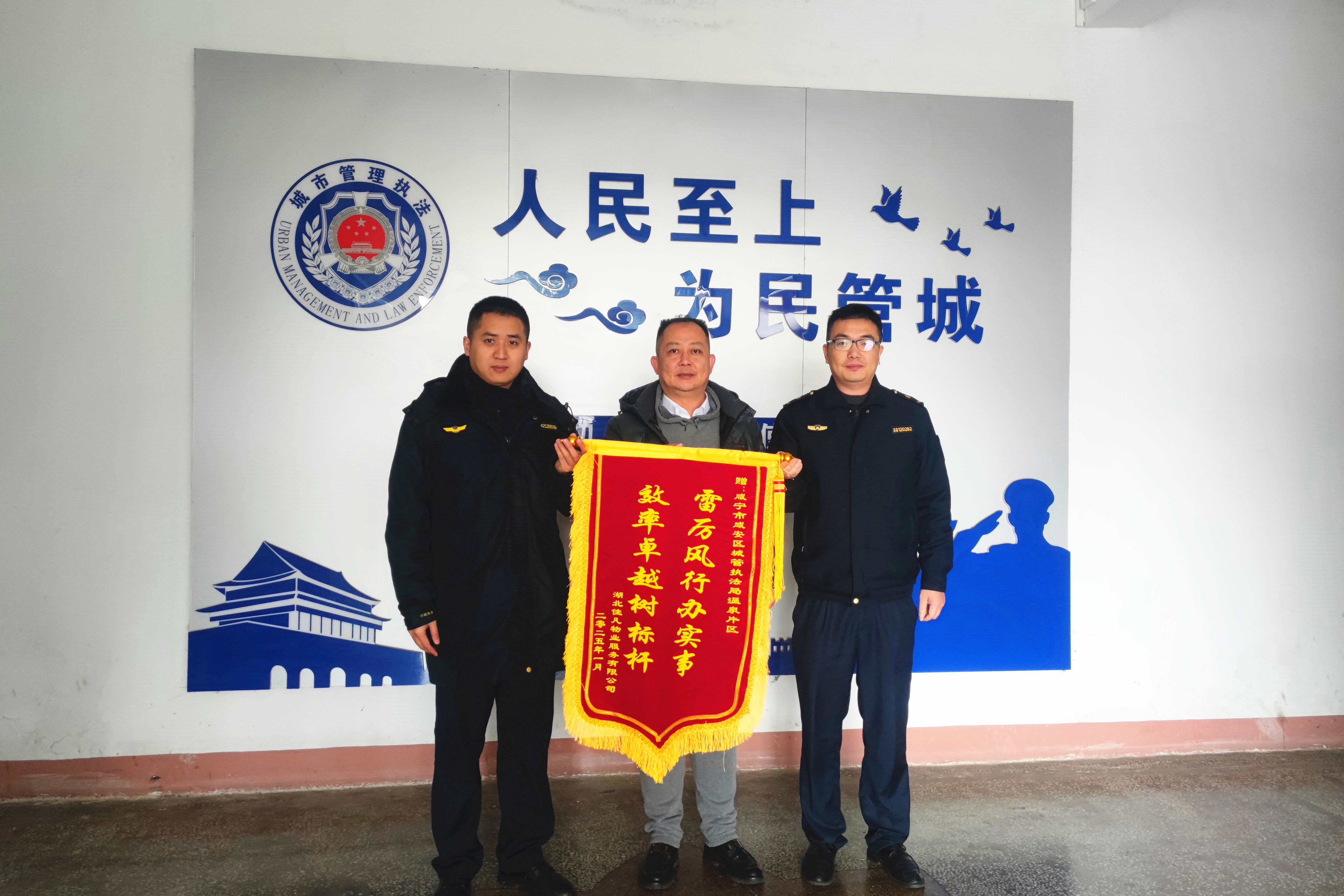 湖北日报客户端讯(通讯员刘浩、郑康)“这广告破破烂烂的,我们一直担心会出事,多亏你们城管行动迅速,这么快就解决了,太感谢你们了!”1月25日,中央城小区业主代表汪先生将一面印有“雷厉风行办实事,效率卓越树标杆”字样的锦旗送到咸安区城管执法局温泉片区,点赞该片区执法人员高效为他们拆除小区内高层破损广告的行为。