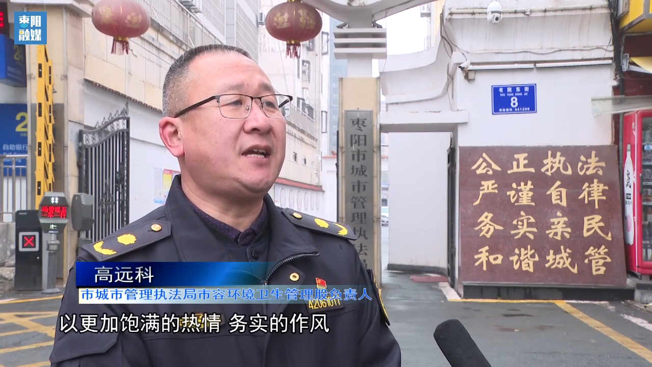 枣阳市城市管理执法局市容环境卫生管理股负责人 高远科:春节期间,我们城管部门干部职工将坚守岗位,强化对各类城市管理问题的处置效率,以更加饱满的热情、务实的作风、有力的举措,净化城市环境,美化城市容貌,让市民度过一个欢乐、祥和的新春佳节。同时,我们呼吁广大市民朋友积极配合,共同参与城市治理工作,让城市环境更加干净靓丽、整洁有序,为建设美好家园贡献力量。