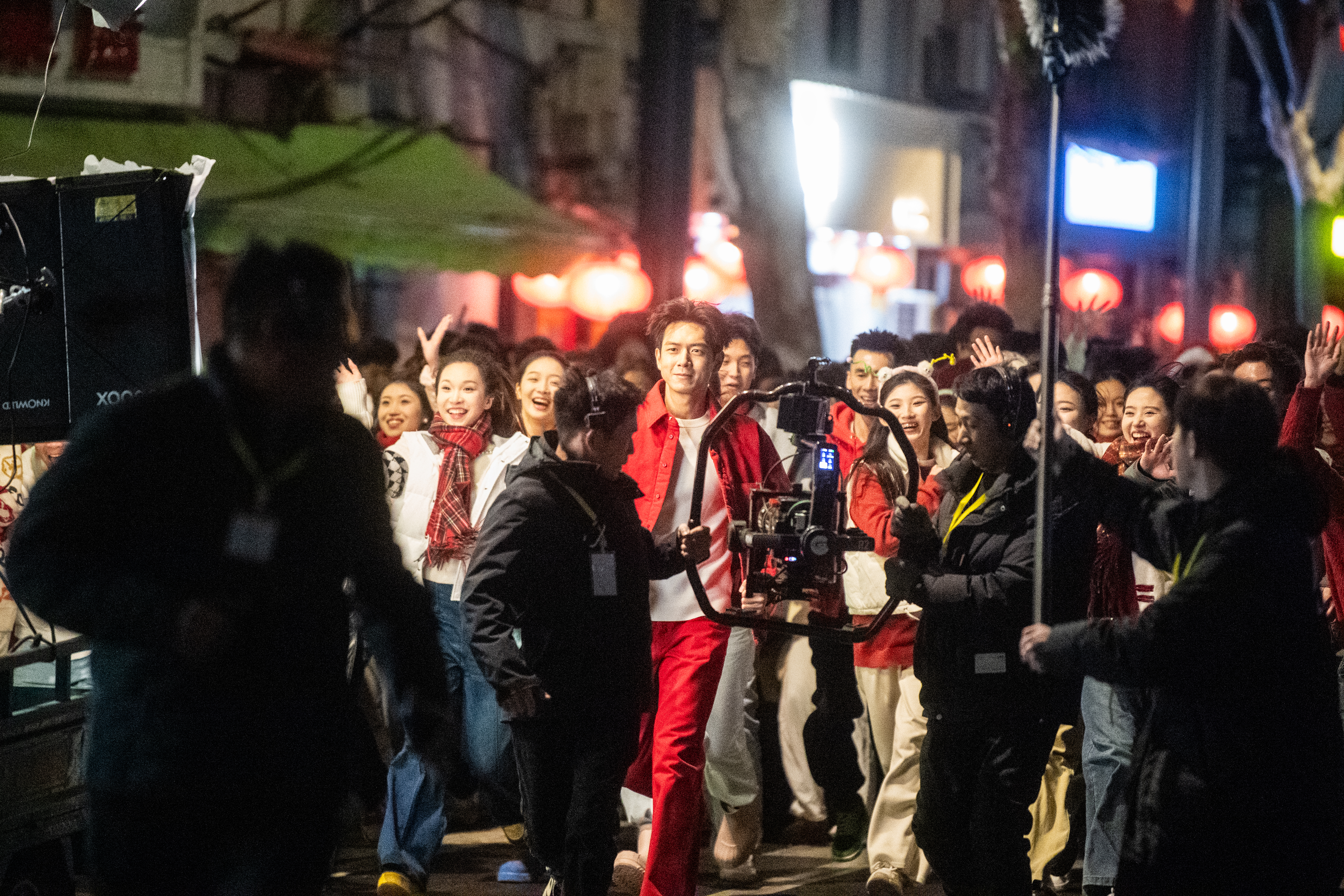 2024年12月28日凌晨,央视春晚武汉分会场节目短片在取景拍摄,湖北籍演员李现带领百余名群众演员在汉口张自忠路上奔跑。(湖北日报全媒记者 何宇欣 摄)