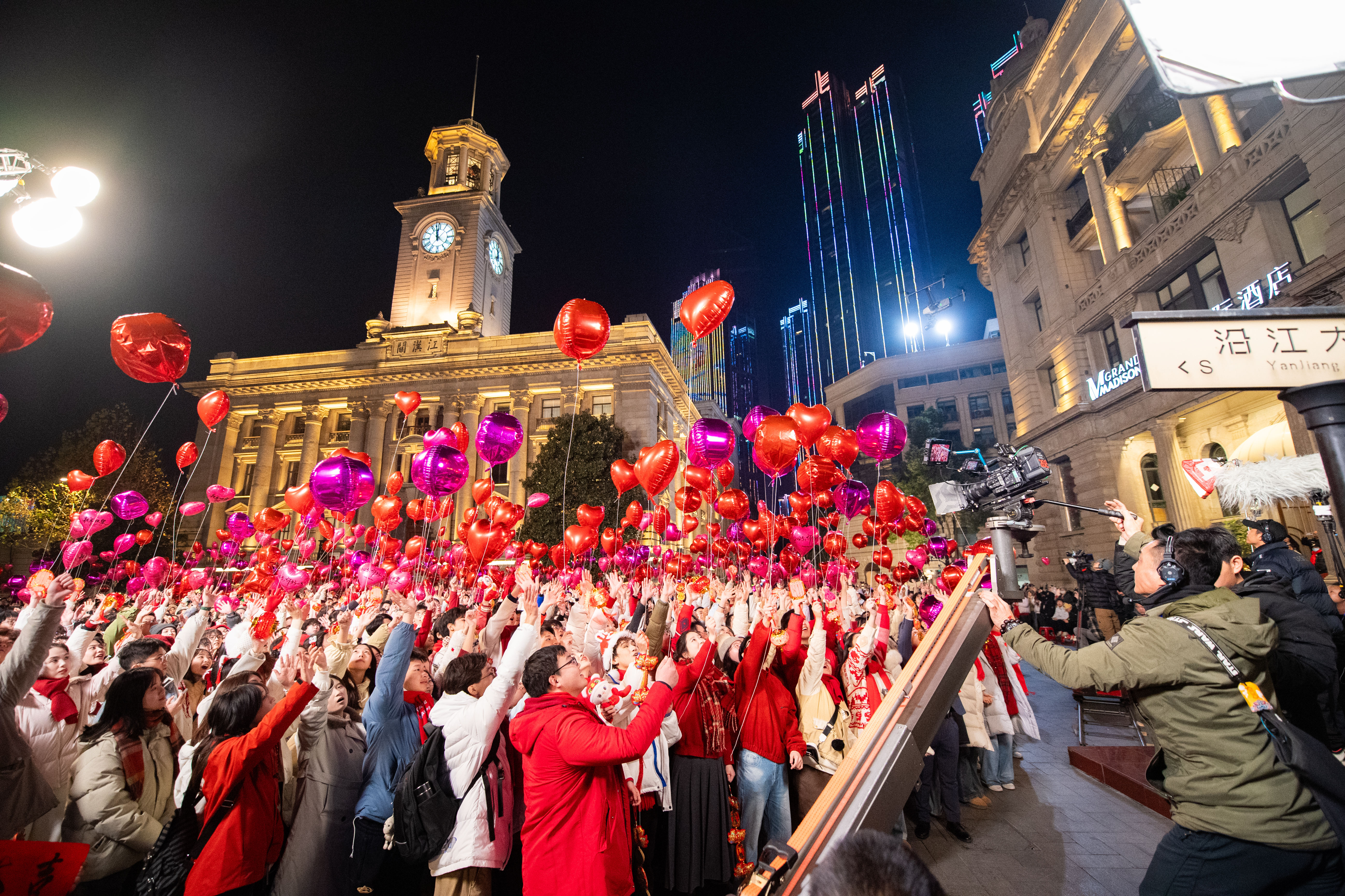 1月13日凌晨,数百名参加央视春晚武汉分会场节目录制的学生演员们,在江汉关前拍摄蛇年钟声敲响放飞气球片段。(湖北日报全媒记者 何宇欣 摄)