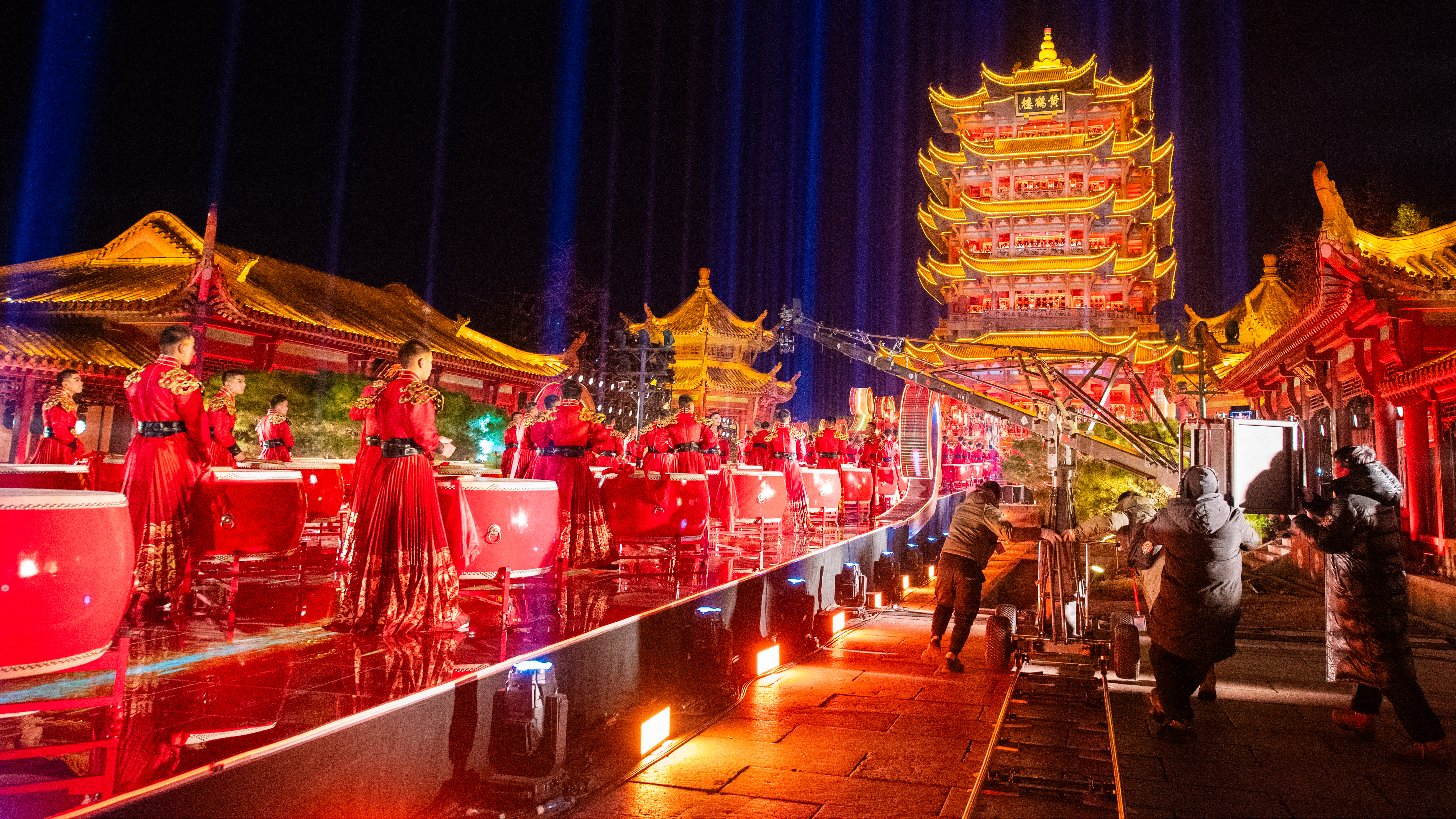 1月9日凌晨,央视2025年春节联欢晚会武汉分会场节目短片在黄鹤楼主舞台紧张录制,摄制组工作人员正在操作摇臂拍摄。(湖北日报全媒记者 何宇欣 摄)