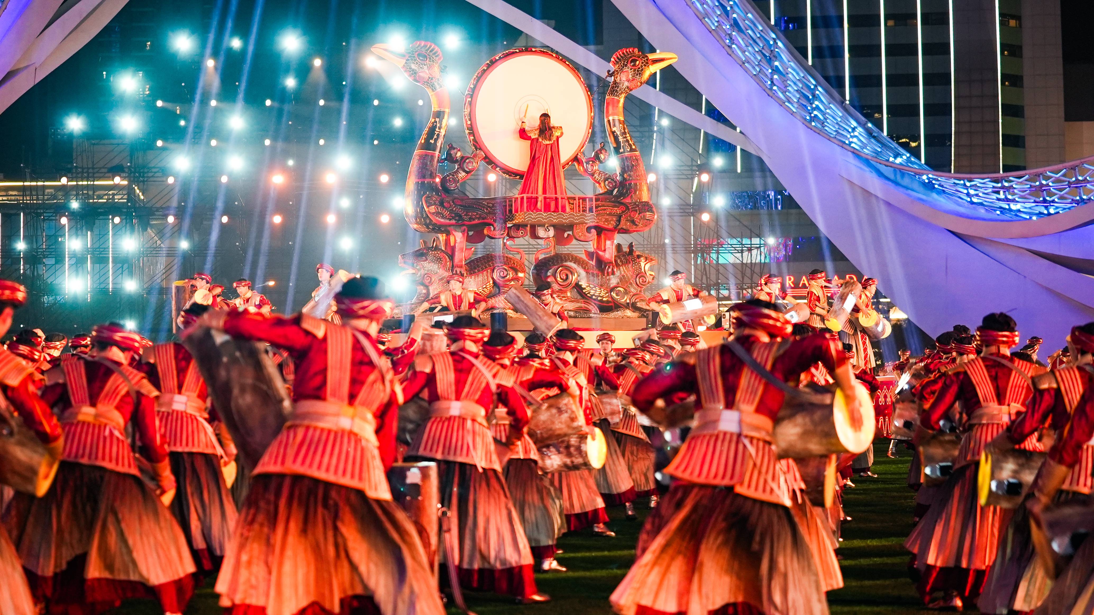 鼓下,640余位勇士列队而立,手持发光的琴鼓,身着古朴英挺的少数民族服饰,与鼓声齐舞。转身、半蹲、举鼓,他们身姿矫健、神采飞扬,舞动间彰显刚柔并济的力量,演绎出一场震撼人心的视听盛宴。