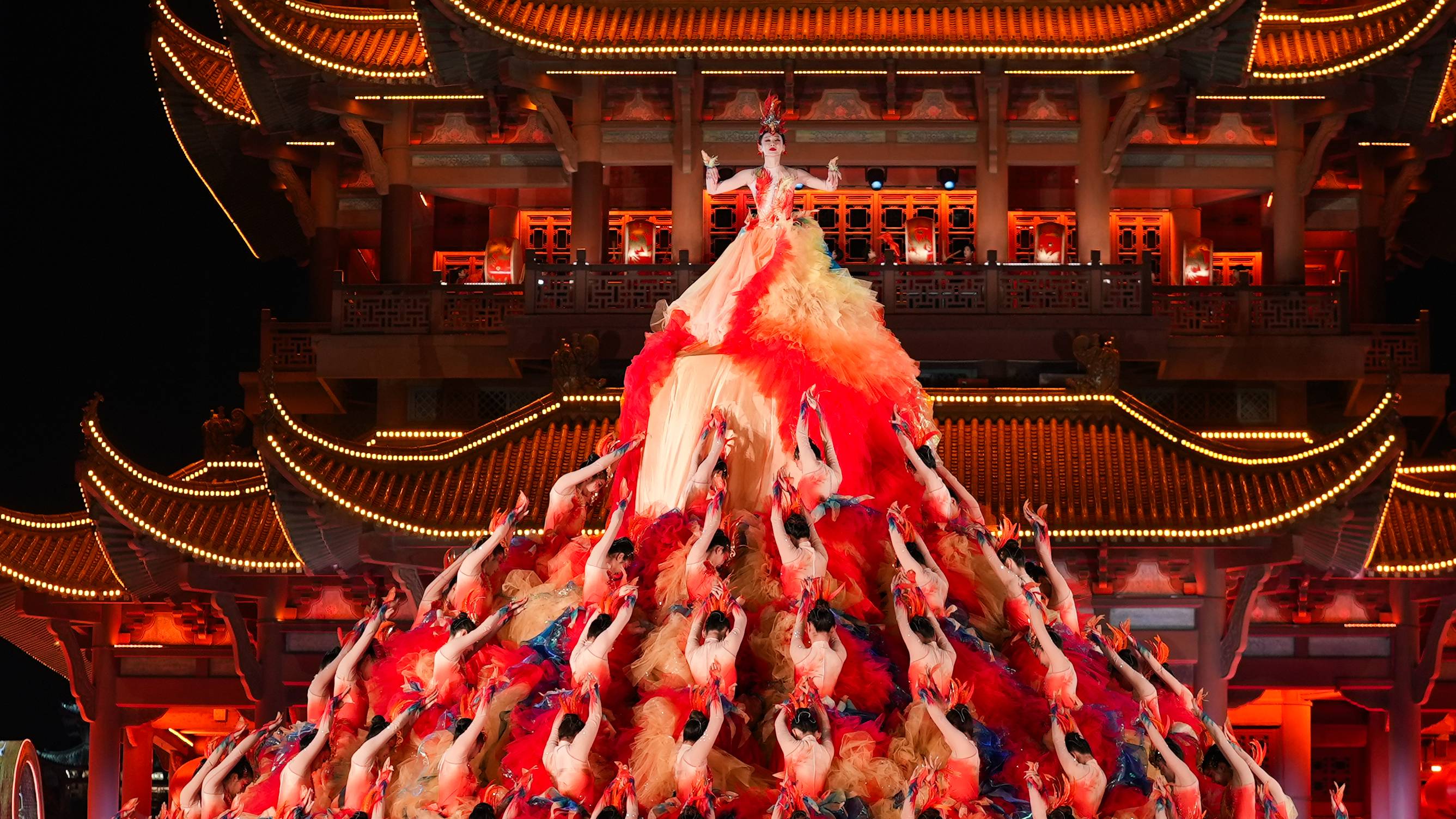 节目渐进高潮,黄鹤楼上,鼓阵齐鸣,凤凰图腾涅槃重生,见证武昌千年古城在新时代浪潮下的时尚蜕变。整个舞台像层叠的蛋糕塔,约有6米高,演员们一层层围绕着中心主演舞动。