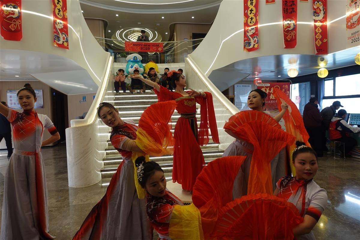 这是宜昌两坝一峡游轮新春首航仪式的一个环节。上午8点半,宜昌旅游码头人潮涌动,土家族舞者跳着摆手舞夹道迎客,长江三峡1号游轮舱内张灯结彩,新春氛围感拉满。