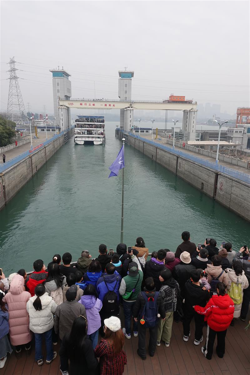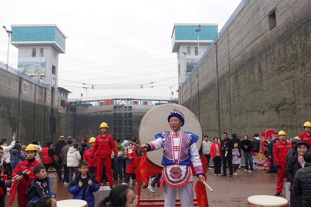 1月30日,正月初二,中午10点,长江三峡1号游轮行至葛洲坝船闸,水涨船高之际,一名老者持槌击鼓,拉长音调唱起祈福祝词。“咚咚咚!一击事业高升,二击前程似锦......”鼓点敲出铿锵的节奏,瞬间点燃游轮的节日气氛,游客驻足在甲板围观这场文化盛宴,共同祈福新春。