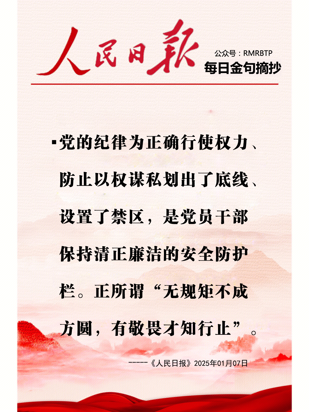 党的纪律为正确行使权力、防止以权谋私划出了底线、设置了禁区,是党员干部保持清正廉洁的安全防护栏。正所谓“无规矩不成方圆,有敬畏才知行止”。----《人民日报》2025年01月07日
